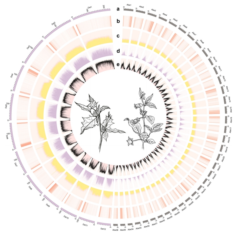 本研究基于三代PacBio、Nanopore、Hi-C等技術成功構建了2個具有代表性的產mTAs的物種:顛茄和曼陀羅染色體水平基因組。研究結果表明:它們在茄科中的親緣關系較遠,但這兩個物種產生mTAs的生物合成途徑是保守的。保守的基因簇和基因重復構成了TAs在該科中廣泛分布的基礎,導致mTAs的分支基因可能在茄科早期祖先物種中進化,但在大多數譜系中都已丟失,顏茄和曼陀羅是例外。此外,研究還鑒定了一種細胞色素P450,它能將莨若堿修飾成去甲莨菪堿。此研究結果為了解茄科植物中TAs的生物合成提供了基因組學基礎,并將有助于通過合成生物學方法進行mTAs的生物技術生產。