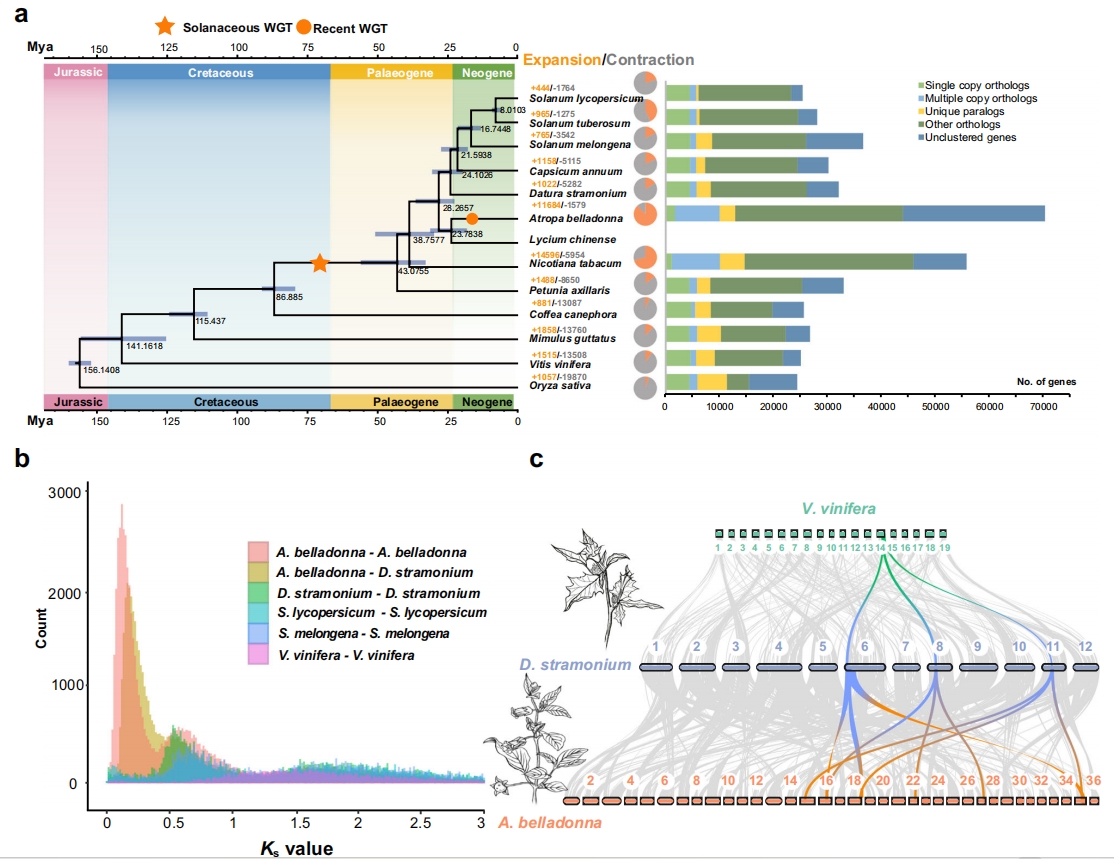 作者利用顛茄和曼陀羅,以及8個茄科物種和4種其他被子植物的207個單拷貝基因進行系統發育分析。結果表明:顛茄和枸杞屬于一個分支,而曼陀羅、辣椒、茄子、番茄和馬鈴薯屬于另一個分支,估計矮牽牛在約43Mya(33-56Mya)從茄科物種分化而來,曼陀羅在約28Mya(23-37Mya)由順茄和枸杞組成的分支分化而來,而顛茄在大約24Mya(18-31Mya)從枸杞分化而來。Ks分析顯示,茄科物種與其他高等雙子葉植物共享較古老的伽馬古多倍體事件。對顛茄、曼陀羅和葡萄進行基因組共線性分析,對于葡萄基因組的各個區域,通常在曼陀羅基因組中能鑒定出3個與之匹配的區域,并且在顛茄和曼陀羅之間也有相似的現象。