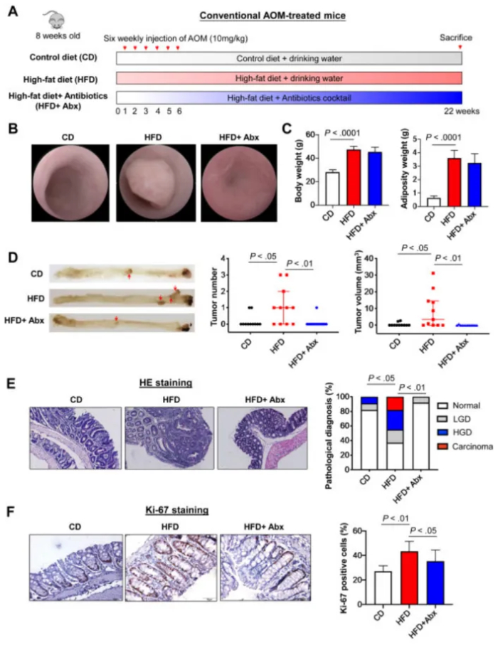 圖1-在AOM模型中,HFD促進了依賴于腸道微生物群的結直腸癌的發展
