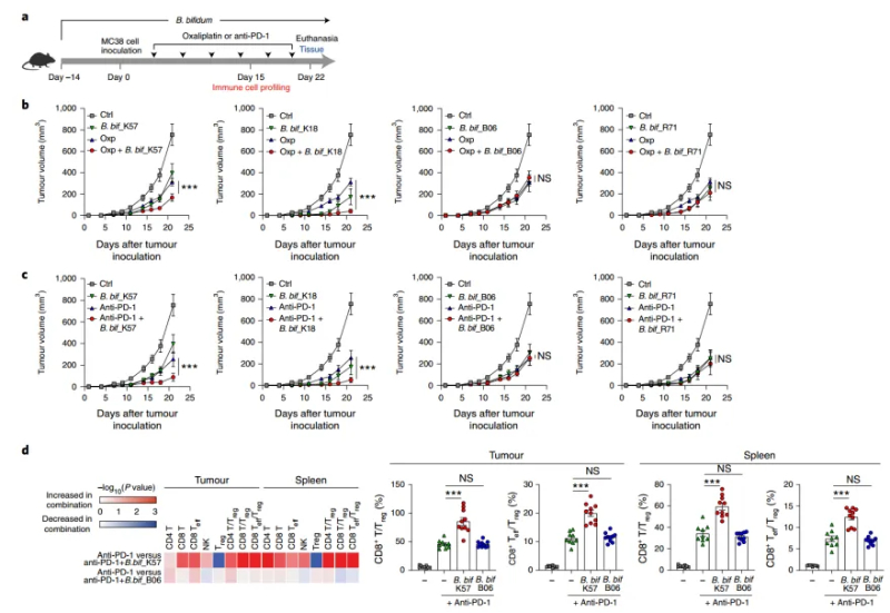 圖3-雙歧桿菌菌株聯合奧沙利鉑或抗pd-1在同基因小鼠腫瘤模型中的協同抗腫瘤作用