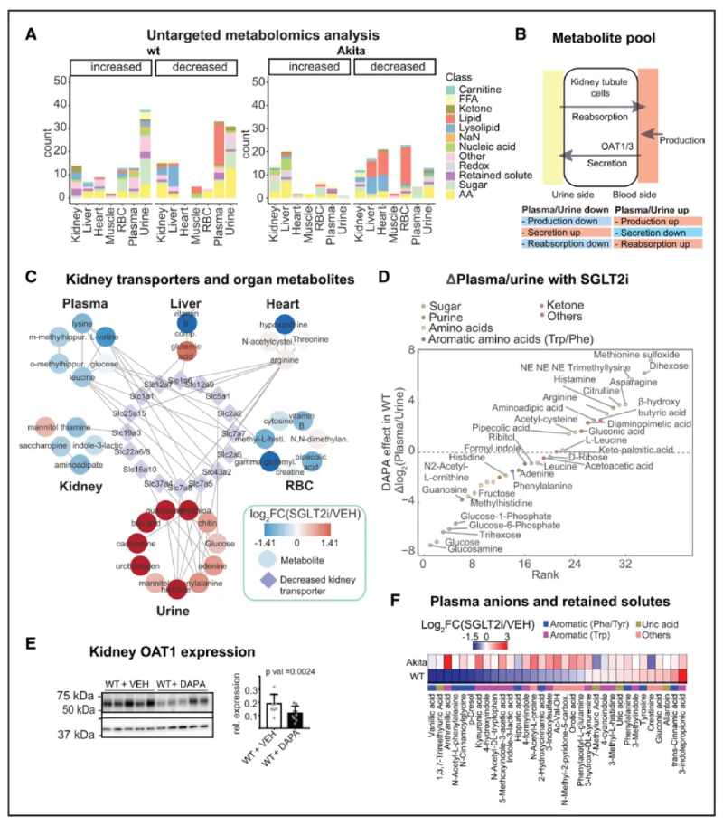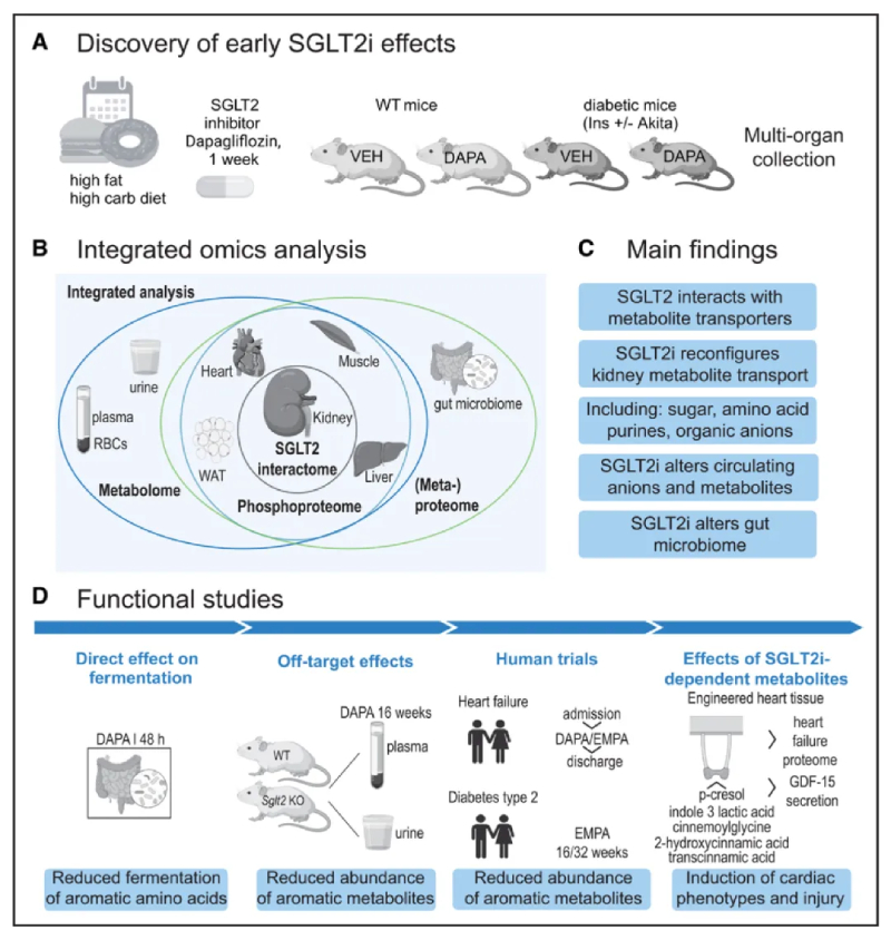 丹麥奧胡斯大學(xué)學(xué)者在Circulation雜志上發(fā)表題為“Metabolic Communication by SGLT2 Inhibition“研究論文,研究團(tuán)隊(duì)使用Akita小鼠模型和臨床隊(duì)列樣品,通過(guò)整合宏基因組、代謝組、蛋白組等多組學(xué)數(shù)據(jù),確定了SGLT2i對(duì)腎臟、心臟、血管和其他器官的幾種SGLT2依賴性效應(yīng)和脫靶效應(yīng),通過(guò)重構(gòu)腎臟代謝物轉(zhuǎn)運(yùn)和全身代謝通訊,發(fā)揮心腎保護(hù)作用。提供了關(guān)于SGLT2相互作用因子和SGLT2i依賴性蛋白質(zhì)組、代謝組、磷酸化蛋白質(zhì)組和宏蛋白質(zhì)組的新見(jiàn)解,從而為SGLT2i新型和早期機(jī)制靶標(biāo)提供了潛在的路線,促進(jìn)代謝藥物的開(kāi)發(fā)。