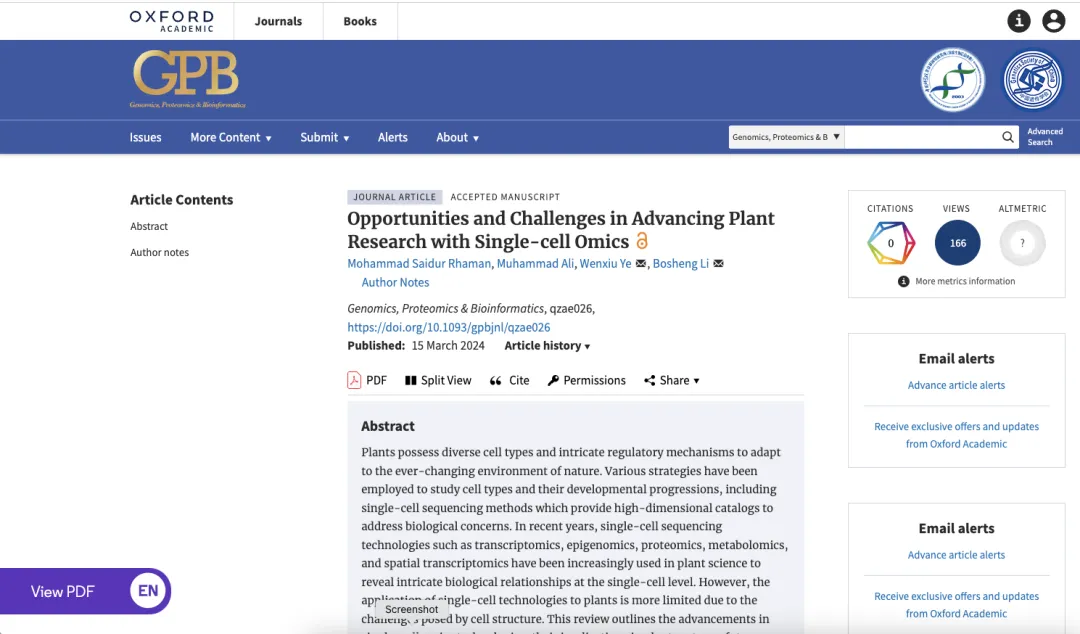 2024年4月,北京大學現代農業研究院李博生團隊和葉文秀團隊在《Genomics, Proteomics, and Bioinformatics》(IF=9.5)雜志上發表了一篇綜述文章,題為《Opportunities and challenges in advancing plant research with single-cell omics》。