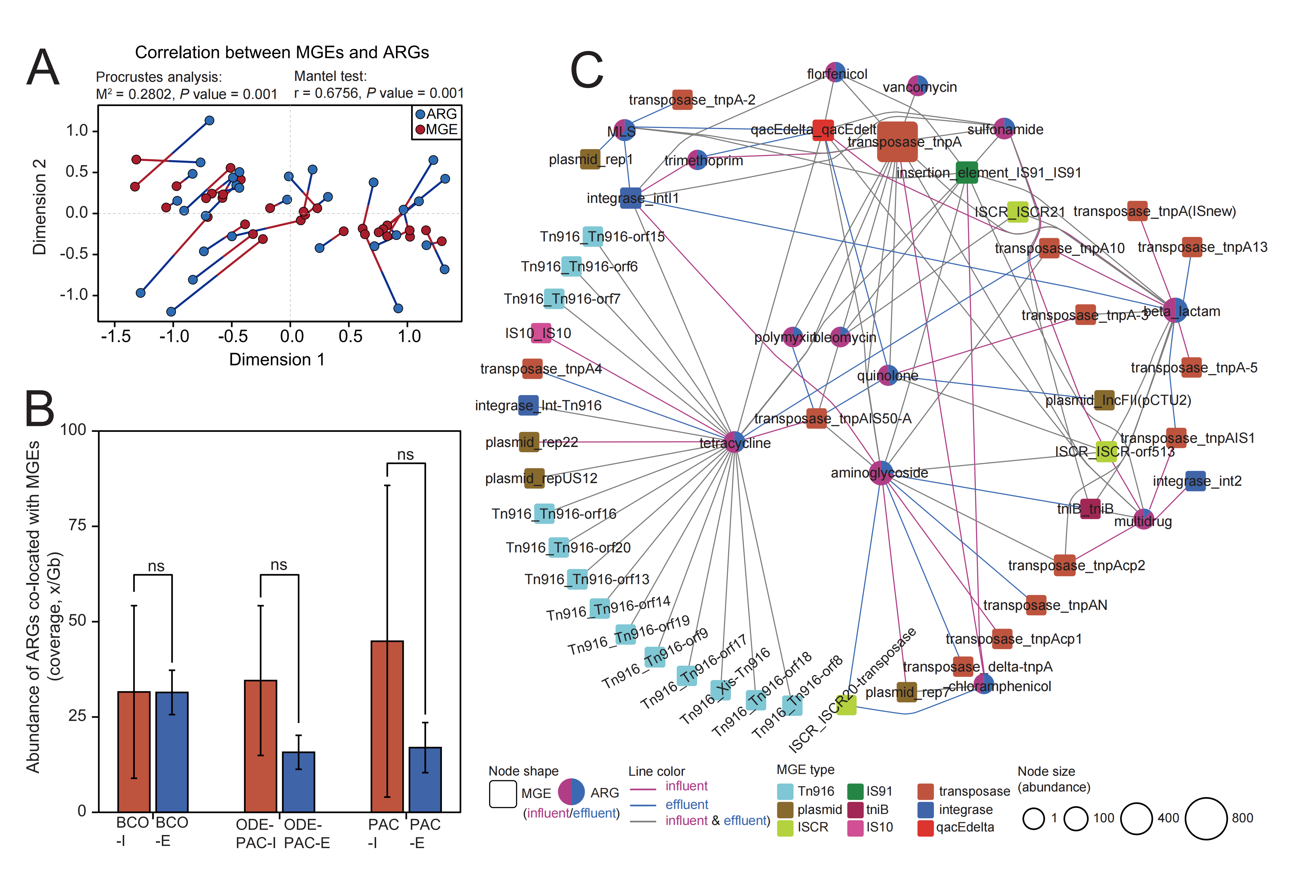 圖3-(A)Procrstes分析和Mantel檢驗(yàn)。(B)三個(gè)熱泵的進(jìn)水和出水中與MRG共存的ARG的相對(duì)豐度的差異。(C)顯示MRG和ARG類型同時(shí)出現(xiàn)的網(wǎng)絡(luò)圖。