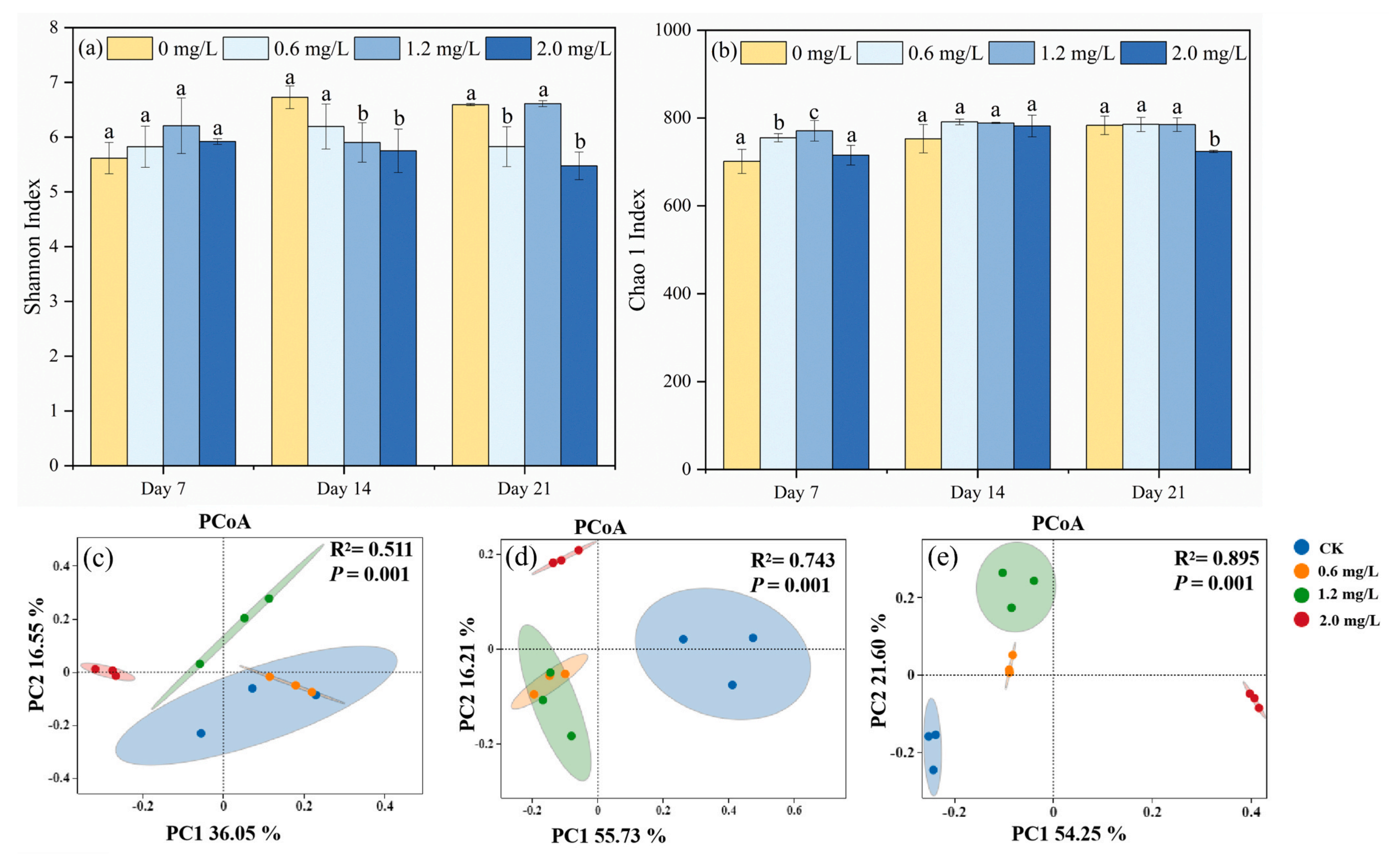 第14天,CK和0.6 mg/L組的Shannon多樣性均高于1.2和2.0 mg/L組(圖2a),處理間Chao1指數無顯著變化(圖2b, P>0.05);