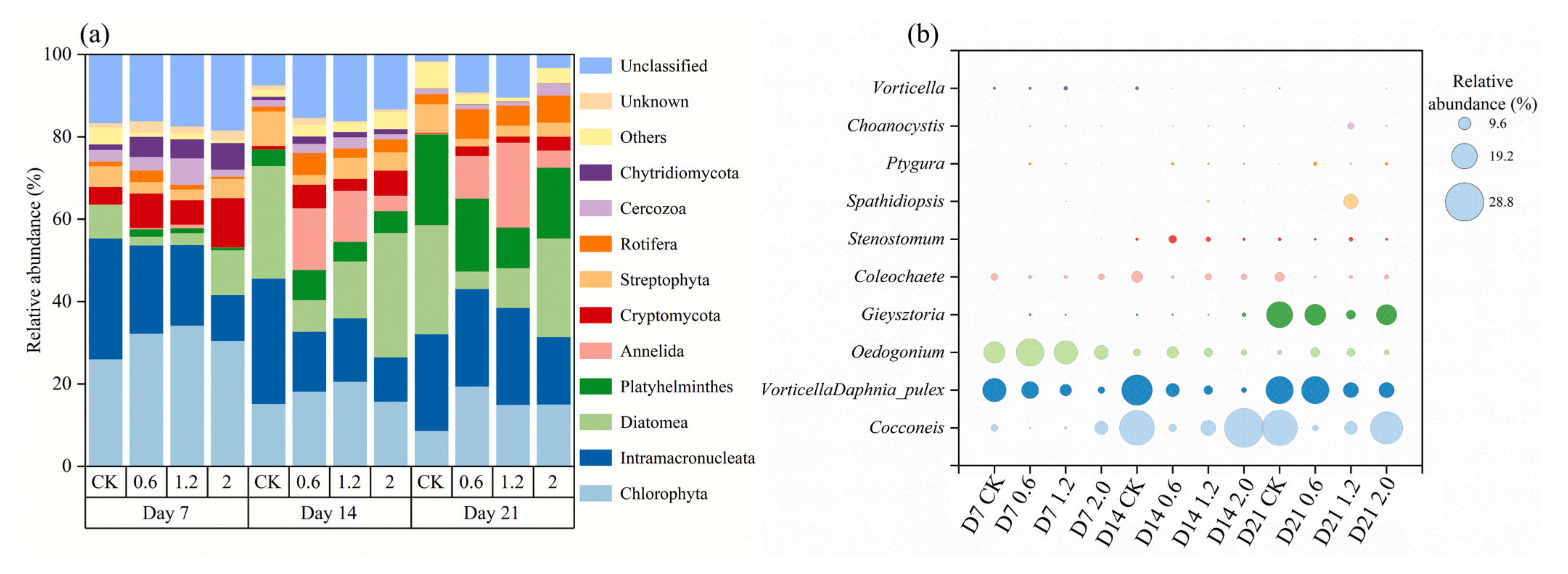 根據注釋結果,在所有樣本中鑒定出10個優勢的微型真核生物門,分別是Chlorophyta(8.71–34.25%),Intramacronucleata (10.69–30.43%),Diatomea (2.11–30.24%), Platyhelminthes (0.02–22.00%),Annelida (0.04–20.60%), Cryptomycota (0.21–11.99%), Streptophyta (1.84–8.37%),Rotifera (0.52–7.23%),Cercozoa (0.91–6.45%),Chytridiomycota (0.07–6.42%) (圖5a)。值得注意的是,在處理組中Rotifers的豐度顯著增加(圖5a)。在實驗后期,尤其是處理組,Platyhelminthes 和 Annelida的相對豐度有所增加(圖5a)。