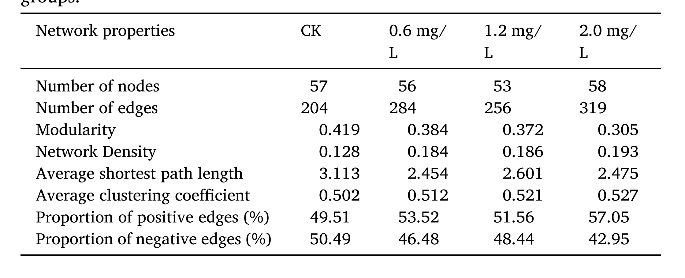 微生物之間相互作用復雜性的增加有助于提高它們之間物質交換的效率,并增強對外部壓力的抵抗力。在Al處理組中觀察到的微型真核生物網絡復雜性的降低,表明微型真核生物群落的穩定性降低,其對外部壓力源的恢復能力降低。暴露于Al后,細菌網絡中正邊的比例降低,而微型真核生物網絡中正邊的比例增加,與細菌群落相比,Al處理組的微型真核生物群落的合作水平更高。