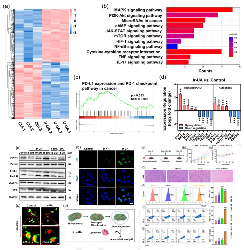 為了證明Ir-UA對PD-L1表達的強大調節能力,研究團隊進行了轉錄組分析,并比較了Ir-UA處理前后的基因表達情況,KEGG分析結果表明,癌癥進展的各種途徑顯著變化。例如,在Ir-UA處理后觀察到與PD-L1表達高度相關的信號通路,如磷脂酰肌醇3-激酶(PI3K)-AKT信號通路、Janus激酶/信號傳感器和轉錄激活因子(JAKSTAT)信號通路、絲裂原活化蛋白激酶(MAPK)信號通路等。此外,還檢測到控制先天或適應性免疫細胞的信號通路,如核因子-κB(NF-κB)信號通路、細胞因子?細胞因子受體相互作用,白細胞介素17(IL-17)信號通路,腫瘤壞死因子信號通路等,它們對從“冷腫瘤”向“熱腫瘤”的轉變和克服αPD-L1耐藥性起到了重要作用。GSEA結果顯示吞噬小體和OXPHOS顯著富集,提示Ir-UA可能觸發自噬小體的形成并抑制OXPHOS。值得注意的是,包括ATF3在內,癌癥中的PD-L1的表達和PD-1檢查點通路也顯著富集,這些結果證實了IrUA增強了PD-L1相關基因的轉錄。細胞毒性評估結果顯示,與A549細胞相比,Ir-UA對正常HLF細胞的半抑制濃度高了5倍,據推測,利用PD-L1作為治療靶點,可能通過選擇性地調節TME中的免疫反應來降低毒性。與Ir-NH2相比較,Ir-UA的親脂性以及A549細胞線粒體中的積累量均有明顯提升,進一步證實了Ir-UA具有較強的線粒體靶向能力。