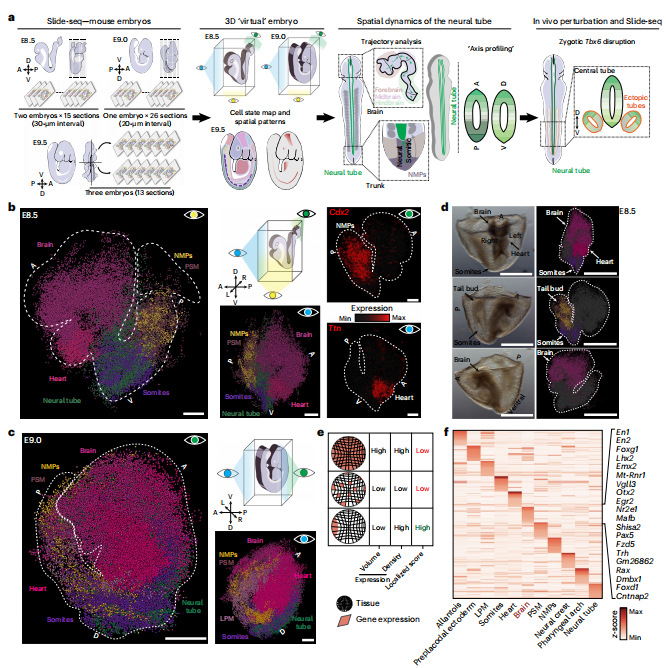 取樣策略:小鼠E8.5期胚胎:2個胚胎,15張10 μm切片,間隔30 μm;小鼠E9.0期胚胎:1個胚胎,26張10 μm切片,間隔20 μm;小鼠E9.5期胚胎:3個胚胎,13張10 μm切片在本研究中,研究人員使用Slide-seq技術構建了完整胚胎E8.5和E9.0以及部分E9.5胚胎的空間轉錄組圖譜。為了支持該項研究的應用,研究人員開發了sc3D——一個重建和探索三維“虛擬胚胎”的工具,它可以定量研究區域化的基因表達模式。發育中的神經管主胚軸的測量揭示了幾個以前未注釋的基因具有不同的空間模式。文章還描述了Tbx6突變胚胎中出現的“異位”神經管的相互沖突的轉錄特性。綜上所述,文章提出了一個用于整個胚胎結構和突變表型時空研究的實驗和計算框架。