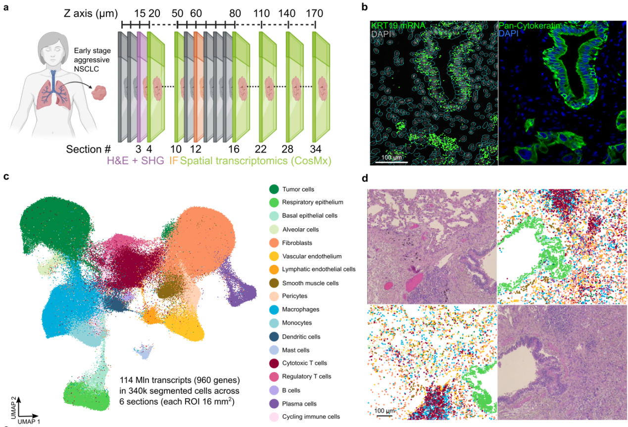 取樣策略:非小細胞肺癌(NSCLC)腫瘤塊連續切下34個5 μm切片:分別進行二次諧波SHG成像、H&E染色、空間轉錄組(1000 Panel CosMx空間分子成像系統)該研究展示了侵襲性人肺癌常規臨床樣本的3D空間圖譜,通過將跨340,000個細胞的960個癌癥相關基因的原位定量與組織力學成分的測量相結合,三維細胞鄰域將腫瘤微環境細分為腫瘤、基質和免疫多細胞生態位。有趣的是,偽時間分析表明,在基質浸潤性腫瘤細胞中檢測到的促侵襲性上皮細胞向間充質細胞轉化(EMT)已經發生在腫瘤表面的一個區域。在那里,肌成纖維細胞和巨噬細胞特異性地與侵襲前腫瘤細胞共定位,它們的多細胞分子特征確定了生存時間較短的患者。與2D相比,3D鄰域通過識別樹突狀生態位,捕捉T細胞生態位的3D擴展和促進生態位特異性細胞-細胞相互作用的量化(包括可藥物免疫檢查點),改善了免疫生態位的表征。