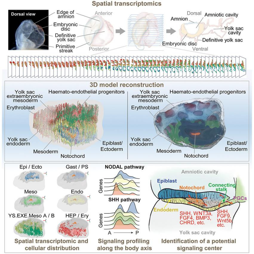 在本研究中,通過構建完整的CS8人類胚胎3D模型,將單個細胞的空間信息與其基因表達譜相結合,系統描繪了胚胎形態、細胞類群、空間位置和轉錄組特征,準確注釋了不同的細胞亞型,深度解析了重要胚外組織羊膜細胞發育過程和卵黃囊造血譜系特化,重點發現了參與早期發育的不同信號通路采用不同的策略沿胚胎A-P軸建立差異激活的特點。這項研究不僅可以確定人類原腸胚形成過程的關鍵細胞和分子特征,還可以指導今后干細胞衍生的人類胚胎模型的生成。