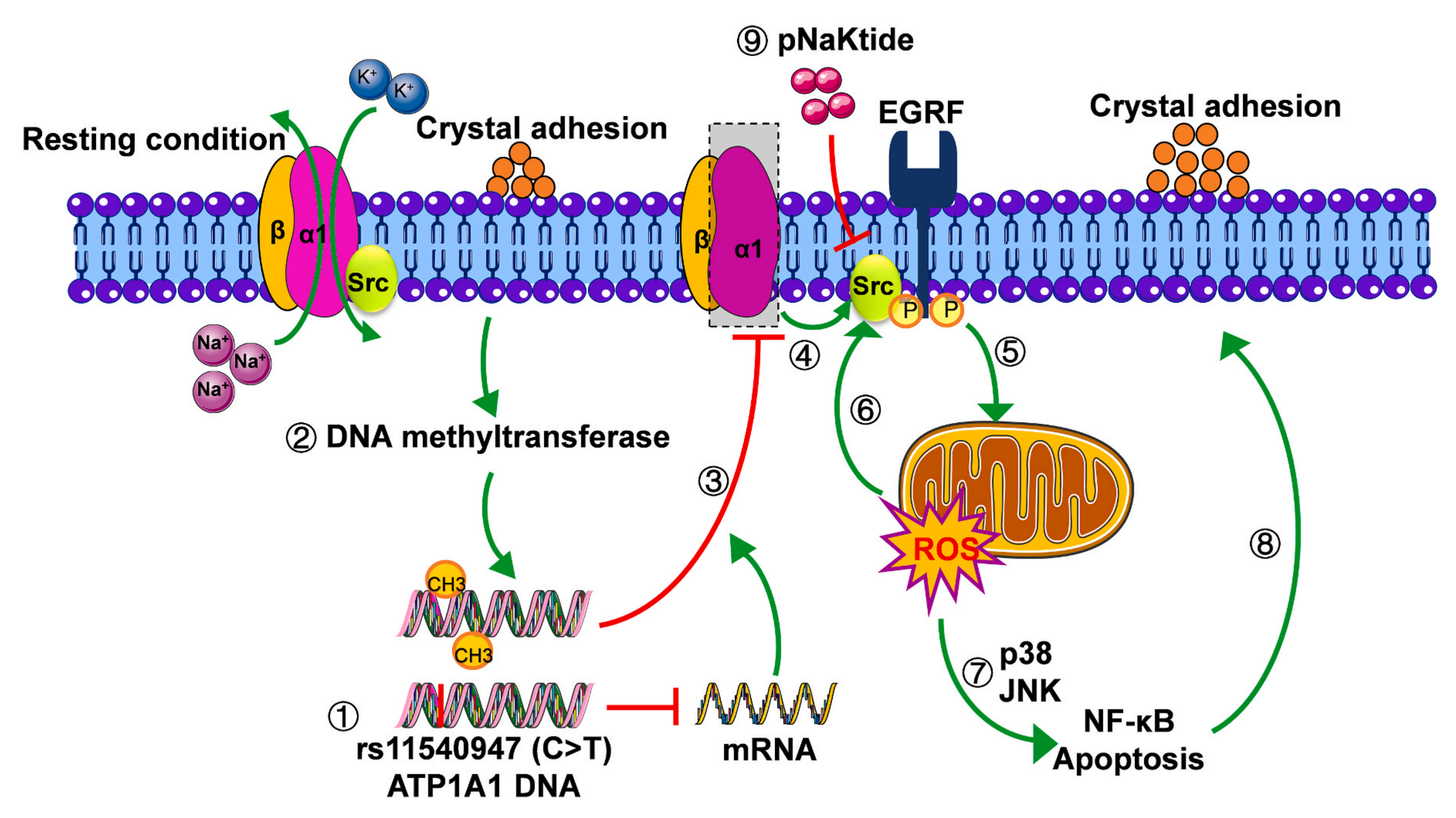 晶體與細胞的粘附是結石形成的關鍵過程,晶體沉積會損傷腎細胞,因此,作者研究了ATP1A1在晶體-細胞粘附中的作用。該研究觀察到用 Ad-hATP1A1 感染和用 pNaKtide 處理后,Ca2+濃度與對照組相比顯著降低,表明ATP1A1過表達和pNaKtide可以阻止晶體與細胞的粘附,從而保護細胞免受CaOx晶體誘導的損傷并減少腎結石的形成。DNA啟動子中CpG島的甲基化是基因沉默的常見機制,COM暴露后,DNA甲基轉移酶(DNMTs)的mRNA和蛋白質水平均顯著升高,而用DNA甲基化抑制劑5Aza-2dc預處理HK2細胞再進行COM暴露處理后,ATP1A1表達量下調;ATP1A1的蛋白水平也被逆轉。這些結果表明,改變的DNA甲基化參與了COM誘導的ATP1A1降低。