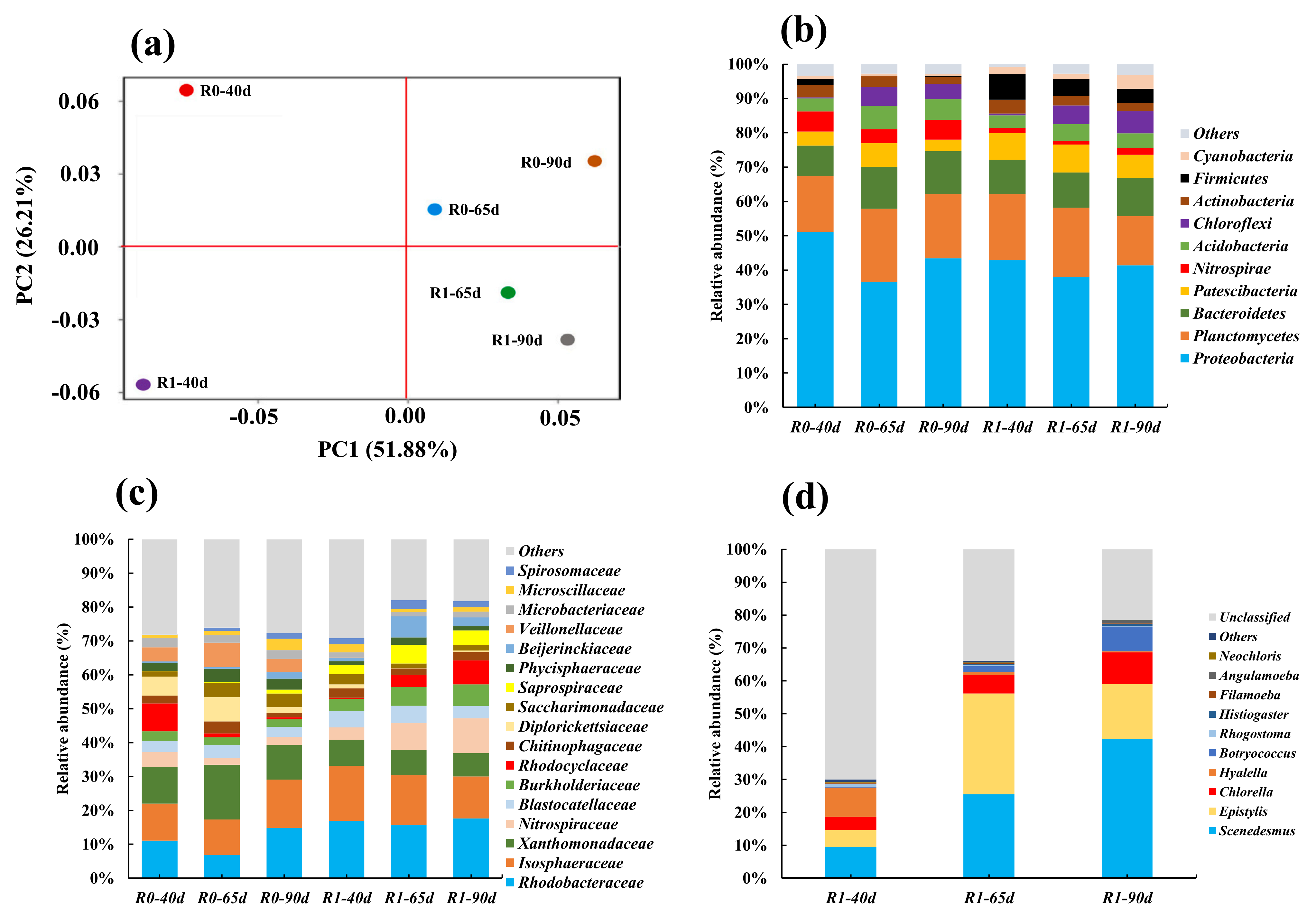 PCoA分析結(jié)果顯示,r0和r1之間在40天時(shí)差異最大,說(shuō)明微藻的生長(zhǎng)導(dǎo)致了BGS和ABGS之間的細(xì)菌進(jìn)化的顯著差異。而在添加抗生素后,R0和R1在第65天和第90天的位置較初始有明顯偏移,表明抗生素的選擇壓力改變了BGS和ABGS的細(xì)菌群落結(jié)構(gòu)。門(mén)水平相對(duì)豐度結(jié)果顯示,變形菌門(mén)、浮霉菌門(mén)和擬桿菌門(mén)一直是R0和R1的三個(gè)優(yōu)勢(shì)門(mén),表面其受抗生素影響較小。研究表明,變形菌門(mén)和擬桿菌門(mén)是好氧廢水處理系統(tǒng)中常見(jiàn)的兩種異養(yǎng)細(xì)菌,主要具有去除氮、磷和水解大分子有機(jī)物的功能,而變形菌門(mén)和浮霉菌門(mén)對(duì)抗生素具有高度的固有耐藥性,并且與大多數(shù)靶ARGs呈正相關(guān),硝化螺旋菌主要富集在r0中,而厚壁菌門(mén)主要富集在R1中。添加抗生素后,氯霉在R0和R1中的相對(duì)豐度上升,而氯霉可作為可移動(dòng)遺傳成分轉(zhuǎn)移的指示物種??扑降姆治鼋Y(jié)果表明,紅桿菌科、異孢菌科和黃單胞菌科是R0和R1的優(yōu)勢(shì)菌,表明他們對(duì)抗生素具有一定程度的耐藥性,并在維持顆粒狀穩(wěn)定性方面發(fā)揮了重要作用。此外,添加抗生素后,硝化螺菌科、紅環(huán)菌科在R0中豐度下降而在R1中上升,腐螺旋菌科也在R1中富集。據(jù)報(bào)道,硝化螺菌科、紅環(huán)菌科和腐螺旋菌科與廢水中營(yíng)養(yǎng)物質(zhì)的去除密切相關(guān),微藻可能促進(jìn)其在ABGS中的生長(zhǎng),也表明ABGS中的微藻生長(zhǎng)也有利于提高硝化螺旋體科、紅環(huán)科和腐螺旋體科的耐藥性。此外,韋榮氏球菌科主要富集在R0中,韋榮氏球菌科與污水處理廠大量ARGs和intI1呈顯著正相關(guān),這可能是造成R0中ABGS中ARGs水平低于BGS的部分原因。真核生物屬水平相對(duì)豐度分析結(jié)果顯示,ABGS中斜生四鏈藻和小球藻的持續(xù)生長(zhǎng)提高了抗生素和常規(guī)污染的去除效率。