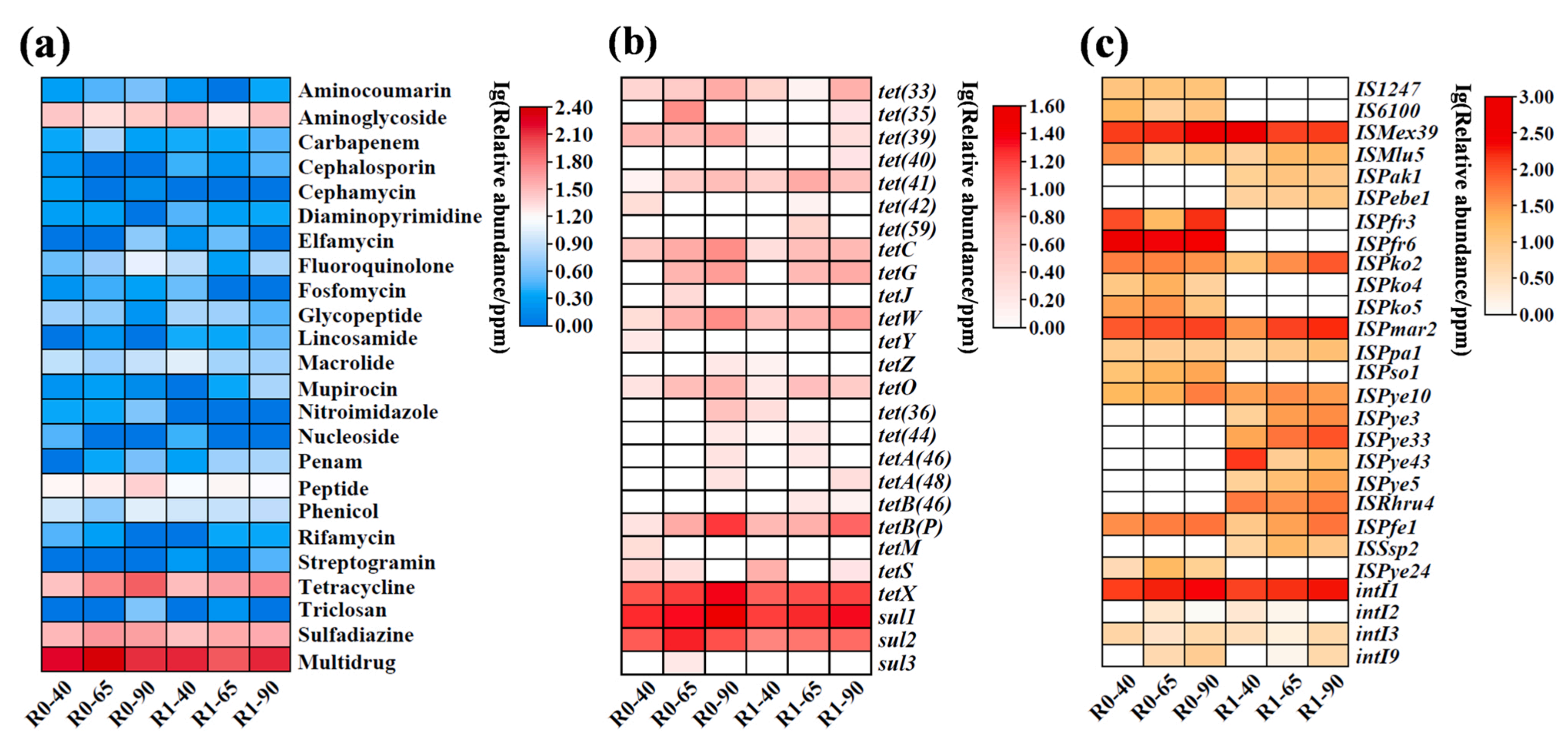 此外,一些非TC和SDZ相關(guān)的ARGs也被富集,是由于抗生素的共選擇效應(yīng),即一些微生物可以編碼存在于同一染色體、質(zhì)粒、轉(zhuǎn)座子或整合子中的多個(gè)ARGs,而氨基糖苷類和多肽的比例增加更明顯,可能是由于它們對(duì)TC和SDZ的選擇壓力更敏感。R0和R1中檢測(cè)到的TC/SDZ相關(guān)的ARGs亞型總數(shù)有26個(gè)((23tets?及 3?suls),其中17個(gè)tets和2個(gè)suls是共有的,R0和R1中tetX基因含量最高,而sul1在R0和R1中為優(yōu)勢(shì)基因,由于tetX基因參與了TC的生物降解和轉(zhuǎn)移,因此兩種反應(yīng)體系中TC的高去除效率可以歸因于該基因的顯著富集,sul1明顯的富集可能與intI1介導(dǎo)的水平基因轉(zhuǎn)移(HGT)過(guò)程有關(guān)。