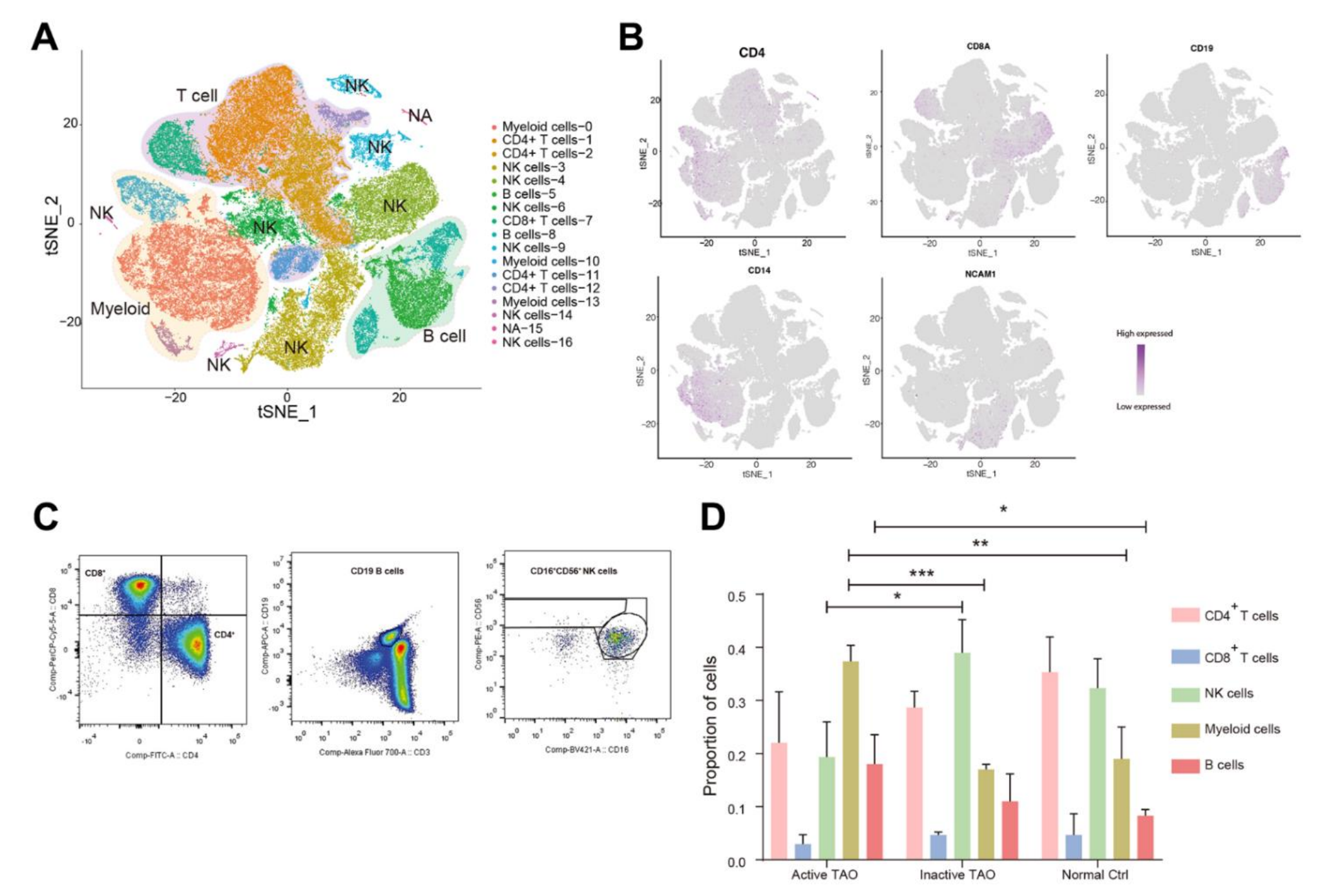 該研究強調了具有活性TAO、非活性TAO和NC的個體中B細胞、DC和單核細胞的比例和轉錄異質性的顯著變化。這些發現為了解活躍TAO期間外周免疫環境中免疫細胞浸潤的變化提供了寶貴的見解。