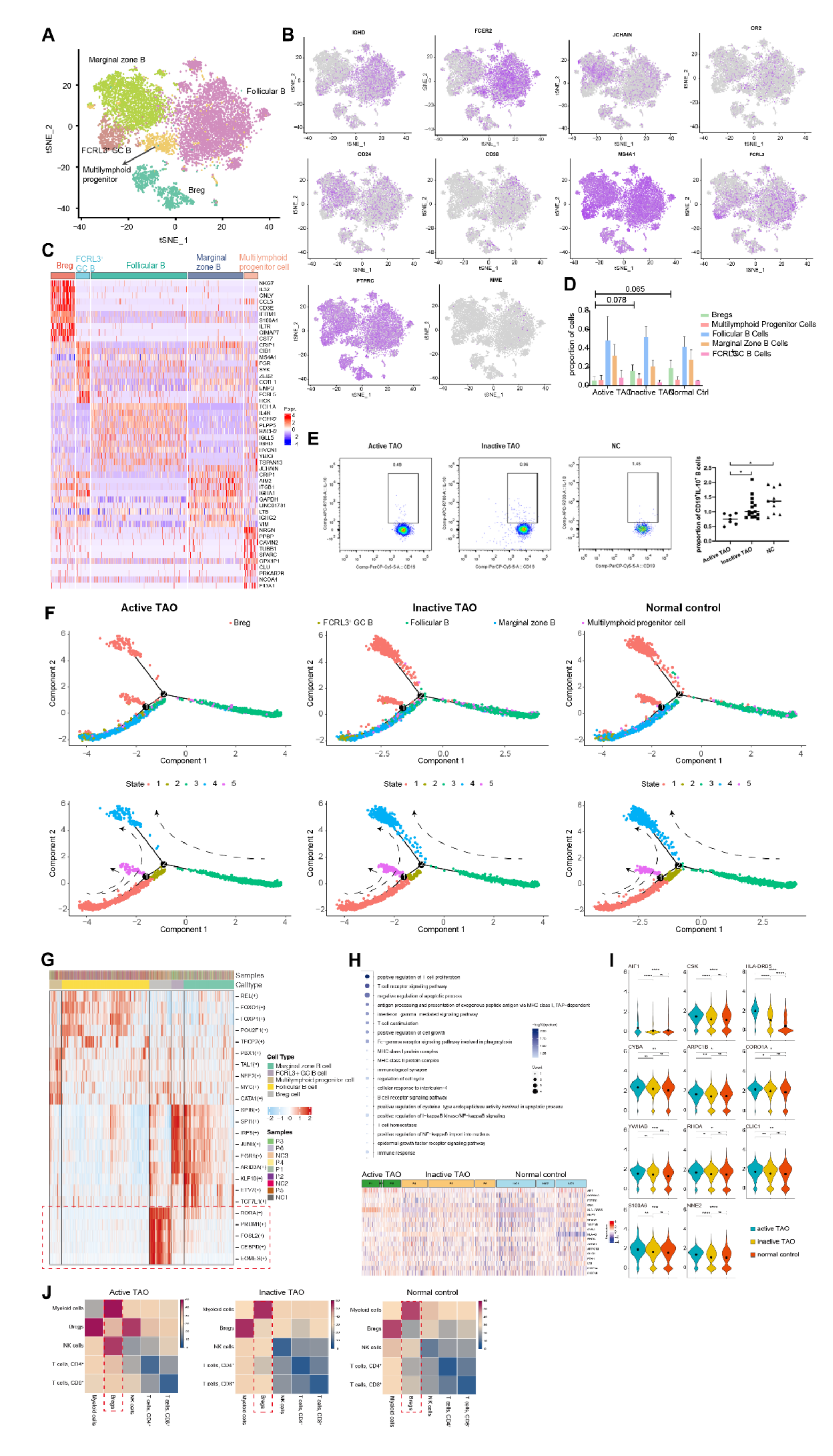 為了全面了解B細胞的異質性及其在TAO中的作用,該研究基于RNA-seq數據進行了進一步分析,以確定其不同的亞群。使用基于圖的聚類,該研究確定了五個亞群,總共包含9493個B 細胞(圖2A)。此外,該研究徹底評估了與B細胞譜系相關的一組綜合基因的表達,以更深入地了解它們的獨特特征。濾泡B細胞的特征是表達IGHD(IgD)和CD23(也稱為FCER2)。邊緣區B群體表現出JCHAIN(IgM) 和CD21的高表達。Bregs根據CD1d、CD5、CD19、CD24、CD38和CD27的表達進行鑒定。此外,生發中心B細胞被認為是顯示高水平CD20 (MS4A1)、CD38?和FCRL3的簇。最后,少量B細胞被鑒定為多淋巴祖細胞,表達CD45RA (PTPRC)、CD34和CD10(MME)(圖2B)。每個B細胞亞群的前10個不同表達基因 (DEG) 為該研究的注釋提供了額外的證據,并支持每個 B 細胞亞群的獨特身份和功能特征。