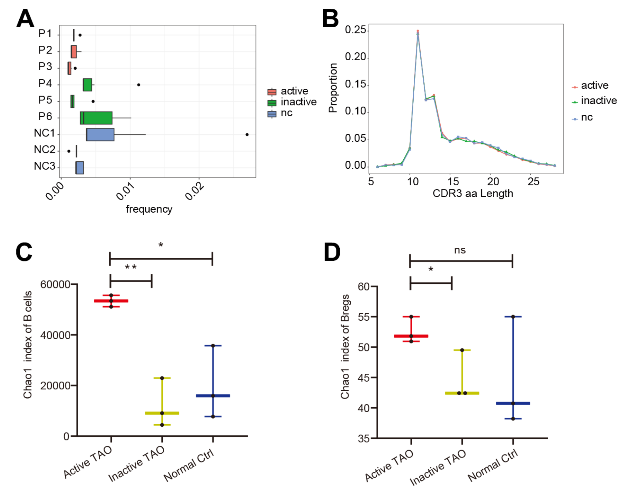 為了全面分析B細胞群中的基因表達和BCR多樣性,該研究對scRNA-seq分析中使用的PBMC樣本進行了scBCR-seq。在活性TAO中,前10個克隆型的比例(0.17%)與非活性組(0.37%,p=0.010)和NC組(0.41%,p=9.31E-05)(圖3A)。然而,對互補決定區3 (CDR3) 長度的分析沒有顯示任何明顯的變化(圖3B)。當檢查CDR3的多樣性時,通過Chao1指數量化,與NC組 (p=0.016) 和非活動TAO組 (p=0.002) (圖3C)。Breg細胞中也出現了類似的趨勢(圖 3D),與NC組相比顯著增加(p=0.011),但活性TAO之間沒有統計學顯著差異組和NC組 (p=0.213)。這些發現表明,雖然活性TAO中前10個克隆型的頻率降低,但在這種情況下CDR3序列的多樣性增加,這可能對免疫反應的調節有影響,并有助于活性TAO的發病機制。