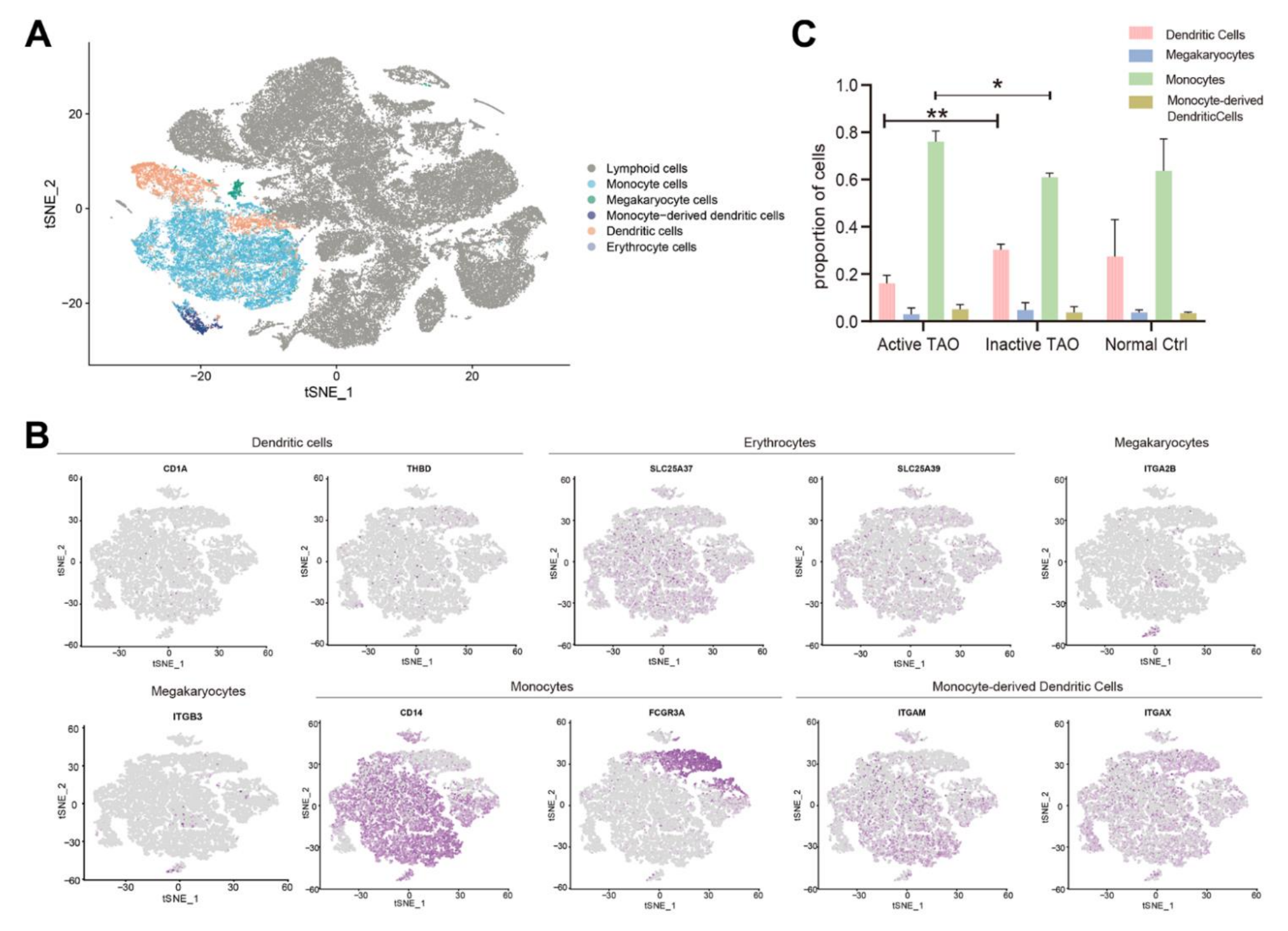 為了評估骨髓細胞在TAO中的參與情況,該研究鑒定了骨髓細胞的主要亞型,并檢查了它們在活性TAO中的配置。分析顯示了五種不同的骨髓細胞群,即單核細胞、巨核細胞、樹突狀細胞 (DC)、單核細胞衍生的DC和紅細胞(圖4A )。這些細胞類型的鑒定基于差異基因表達和對已建立的譜系標記的檢查(圖4B)。活性TAO 和非活性TAO之間的比較揭示了單核細胞和DC比例的顯著差異。與非活動TAO組相比,活動TAO患者的單核細胞比例顯著較高 (p=0.006),而活動TAO中DC的比例顯著較低 (p= 0.003) (圖4C)。這些發現表明,單核細胞水平增加和DC數量減少可能是TAO患者活動性疾病狀態的特征。