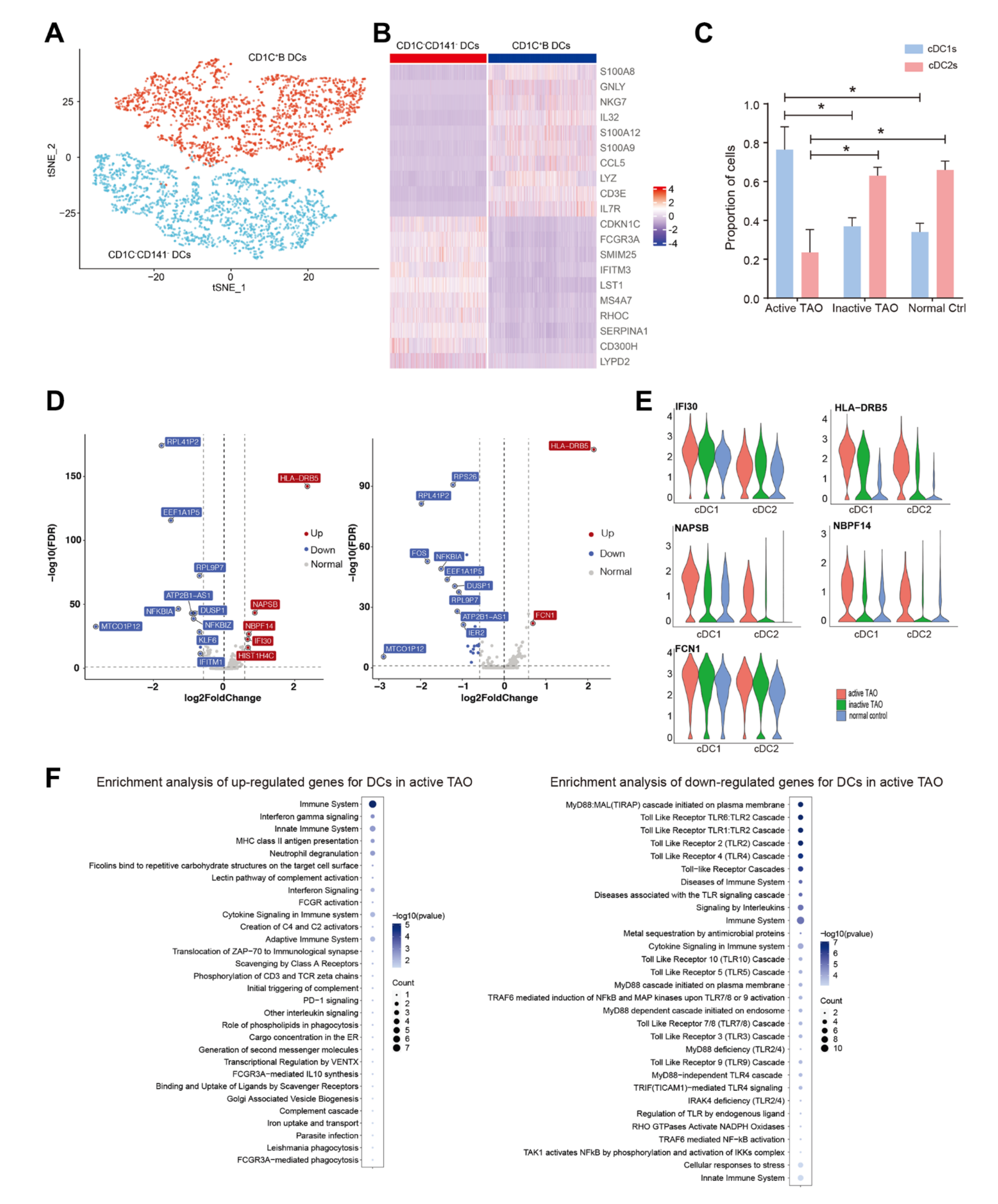 DC被細分為三個不同的子簇。Cluster 0被指定為cDC1s,其特征是高表達CDKN1C、FCGR3A、SMIM25、IFITM3、LST1和MS4A7,以及CD1C和 CD141的低表達。簇1和簇2被鑒定為cDC2,其炎癥基因的表達水平升高,例如 CD14、S100A8、GNLY、NKG7 、IL32和S100A12(圖5A、5B)。cDC1s的比例在活性TAO中顯著較高,而cDC2s在非活性TAO和NC中更為普遍(圖 5C)。鑒于cDC1和cDC2在免疫調節中發揮不同的作用- cDC1專門誘導Th2反應,而cDC2亞群表現出更強大的誘導Th1反應的能力[42],該研究進一步檢查了它們的基因表達譜。