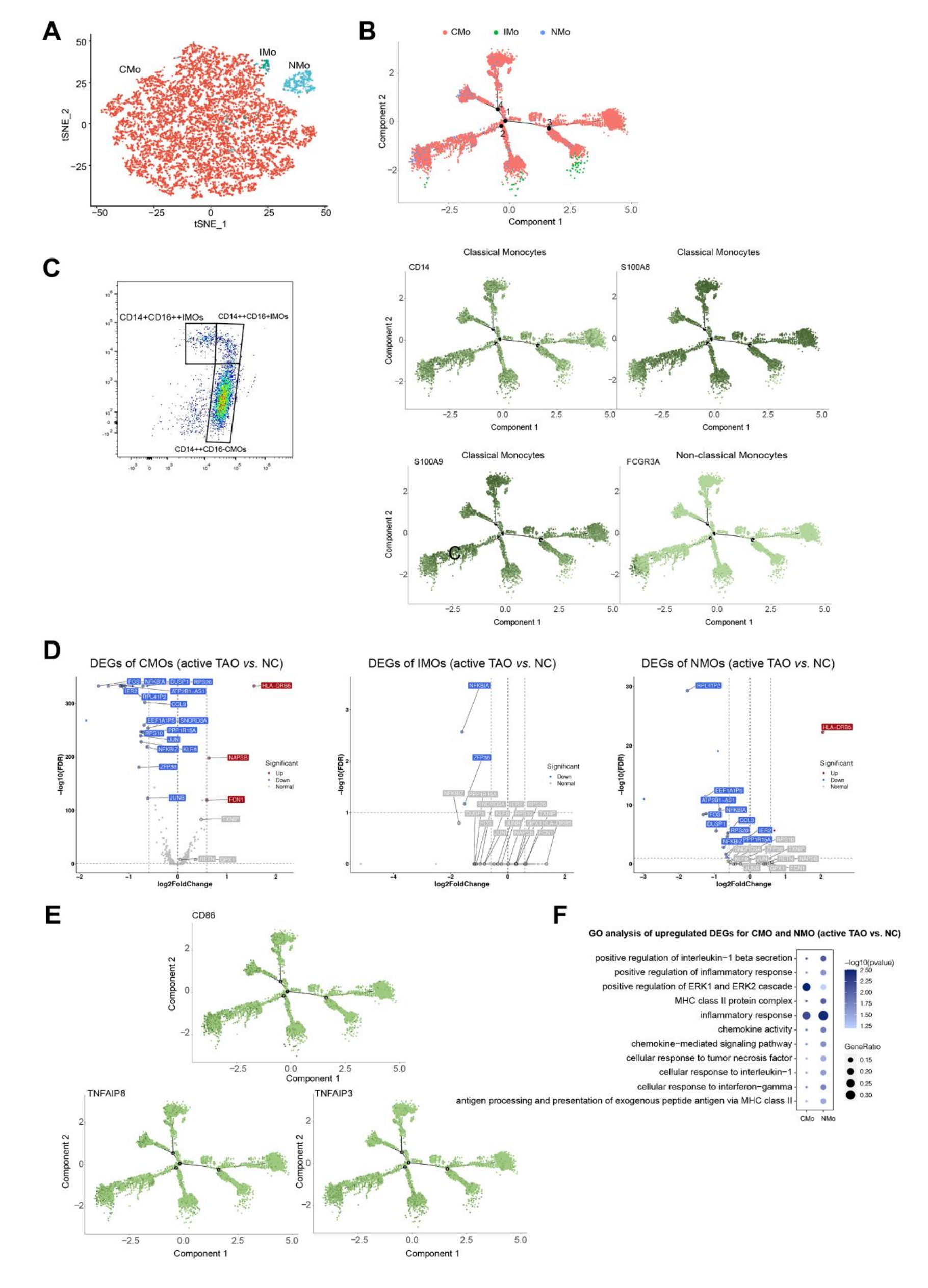 作者的聚類分析成功地從總共 12,959 個單核細胞中識別出三個不同的亞群。第一個簇的特征是經典單核細胞 (CMO),其表現出高表達水平的CD14、S100A8 和 S100A9。第二個簇被鑒定為非經典單核細胞 (NMO),其特征是高表達FCGR3A(也稱為 CD16)。第三簇被識別為中間單核細胞 (IMO),CD14和FCGR3A均高表達(圖6A、6B)。為了驗證這些單核細胞亞簇,進行了流式細胞術分析,確認 CMO為CD14++CD16-,NMO為CD14+CD16++,IMO為CD14++CD16+(圖6C)。軌跡推斷分析表明,單核細胞遵循從CMO開始并向NMO和IMO狀態分支的發育軌跡(圖6B)。這些對TAO期間單核細胞發育狀態變化的觀察表明它們在該疾病中的潛在作用。