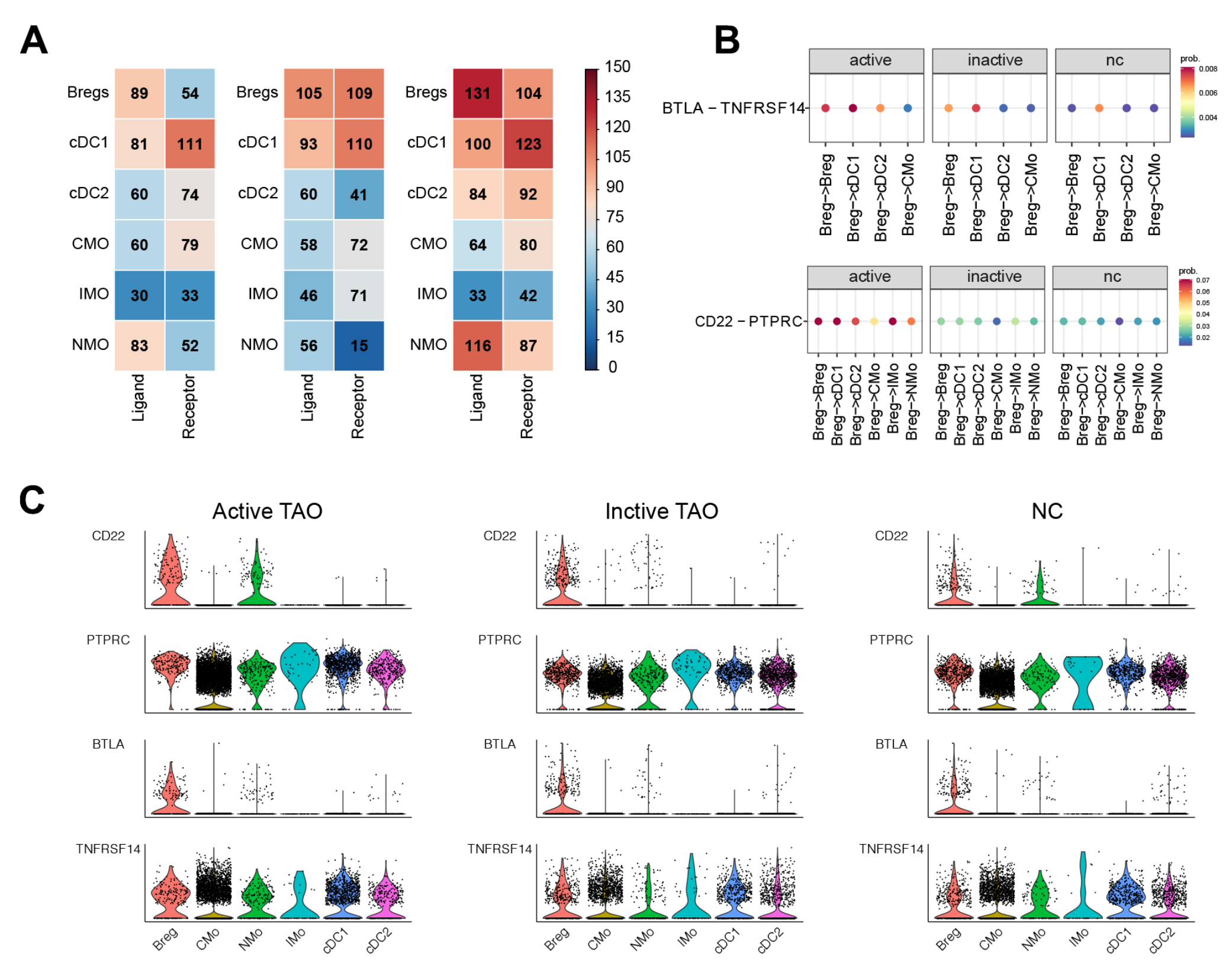 進一步檢查了活躍TAO背景下Breg、DC和單核細胞之間的細胞相互作用。該分析總共確定了1,352對重要的相互作用。值得注意的是,Bregs被發現表現出最多數量的配體,而cDC1亞簇則表現出最多數量的受體。值得注意的是,與非活性TAO 和正常對照組(NC)相比,Bregs在活性TAO中顯示出配體數量增加(圖7A)。