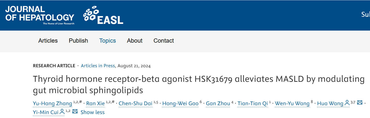 Zhang YH, Xie R, Dai CS, et al. Thyroid hormone receptor-beta agonist HSK31679 alleviates MASLD by modulating gut microbial sphingolipids. J Hepatol.?Published online August 22, 2024. doi:10.1016/j.jhep.2024.08.008