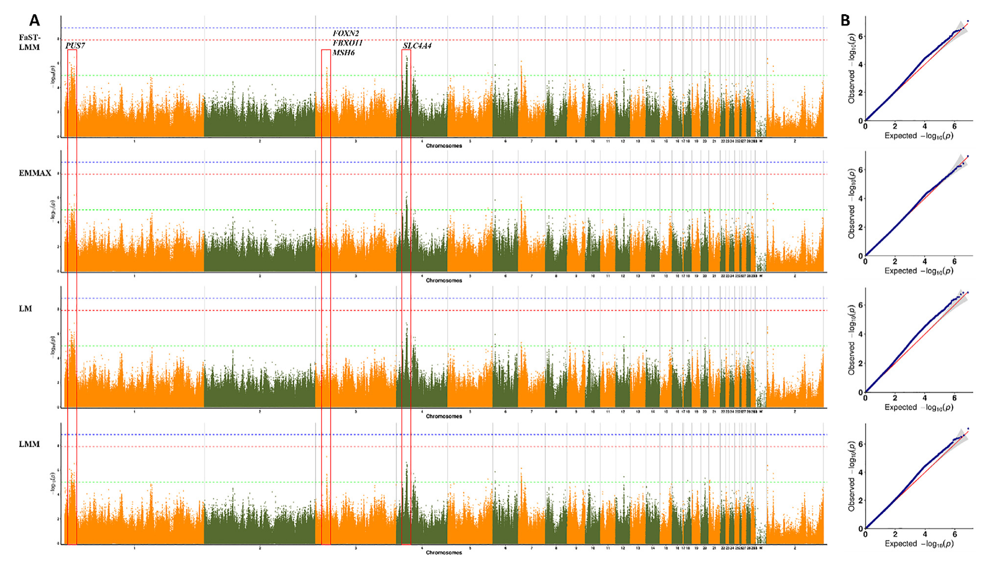 作者對(duì)出生體重(BWB)、1周體重(BW1)、3周體重(BW3)、5周體重(BW5)和7周體重(BW7)進(jìn)行了全基因組關(guān)聯(lián)分析,4種統(tǒng)計(jì)模型比較研究表明,F(xiàn)aST-LMM表現(xiàn)出最優(yōu)的效率,產(chǎn)生更多的結(jié)果和最小的假陽性。