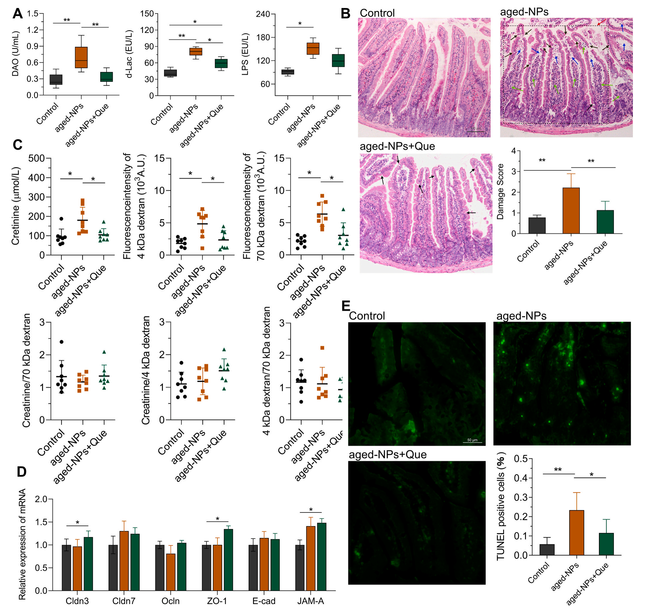 槲皮素 (Que) 占膳食總黃酮類化合物的 60-75%,是一種天然化合物,存在于人類飲食中的各種食物中,包括蔬菜、水果和茶,Que 及其衍生物可以調節多個細胞內靶標和細胞信號傳導過程的能力,具有抗氧化和抗炎分子的作用,探索膳食補充劑 Que 是否可以改善 NPs 誘導的腸道屏障功能障礙具有重要意義。本研究通過轉錄組學、組織病理學和免疫學分析探討老化 NPs 暴露下腸道屏障損傷的機制,此外,還評估了 Que 在老化 NPs 暴露下對腸道屏障的積極影響。