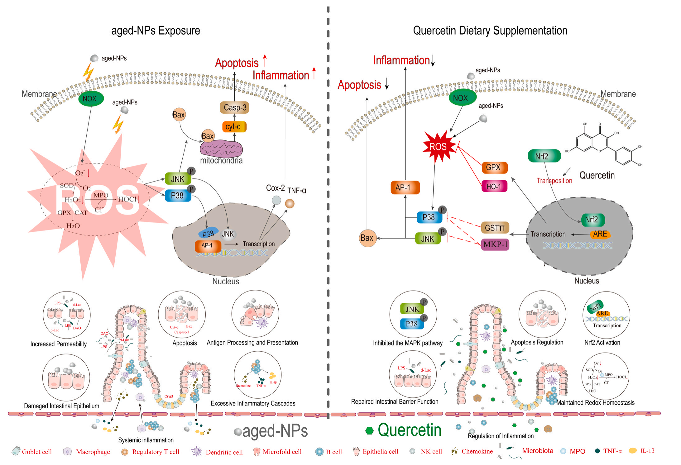 環境與生物生存息息相關,而環境污染也對人類等生物的健康產生威脅,例如微塑料/納米塑料(MPs/NPs)的危害目前已經波及到越來越大的范圍,因此關于納米塑料危害的研究熱度一直居高不下。西北農林科技大學李振宇教授團隊于2024年5月在?Journal of Hazardous materials?期刊發表題為“ Nanoplastics induced health risk: Insights into intestinal barrier homeostasis and potential remediation strategy by dietary intervention ” 的研究論文,研究了老化NPs對腸道屏障穩態的影響,并通過轉錄組學和分子生物學分析探討了槲皮素對老化NPs毒性的緩解作用。