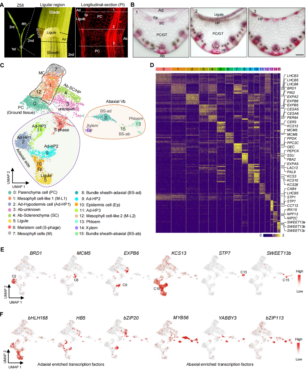 葉片角度(Leaf Angle, LA)是影響玉米種植密度和產量的關鍵因素。然而,調控葉片角度形成的機制尚不清楚。該研究通過對不同玉米自交系的莖葉枕區域進行比較組織學分析,發現葉片角度大小顯著受到莖葉枕上表皮韌皮纖維細胞(SC)的初始伸長和隨后的木質化的影響。通過批量和單細胞核RNA測序,生成了莖葉枕區域的全面轉錄組圖譜,并鑒定了許多可能影響其特化為SC的下皮細胞富集基因。