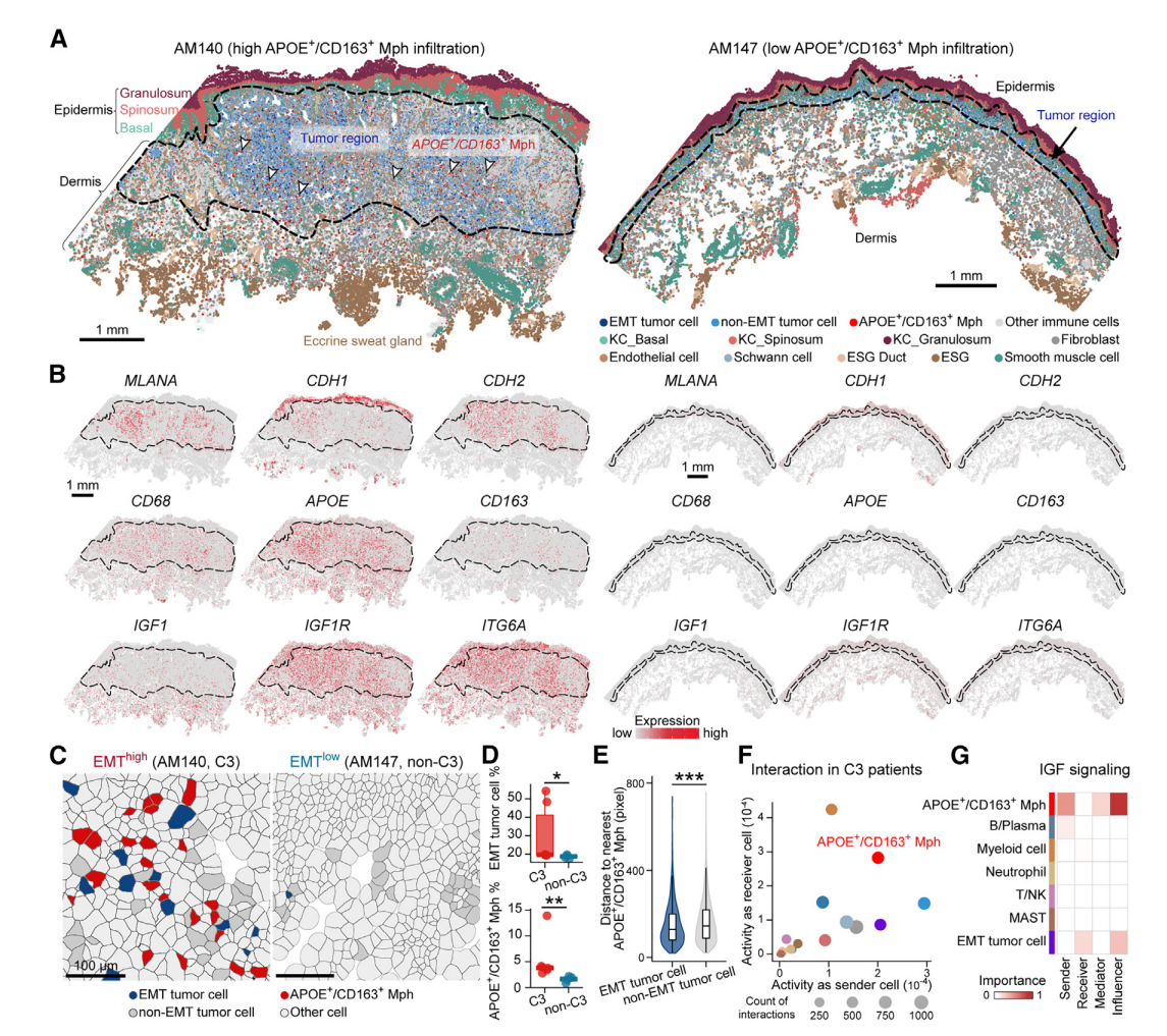 數據表明(與單細胞數據聯合分析)C3 亞型的 EMT 腫瘤細胞占比高,并且有 APOE+CD163+ 巨噬細胞的浸潤,巨噬細胞與 EMT 腫瘤細胞具有共定位特征。CellChat 互作分析驗證了 APOE+CD163+ 巨噬細胞的高度受體配體互作,與單細胞轉錄組結果高度一致(APOE+/CD163+ 巨噬細胞是空間中 IGF 通路網絡的發送者(sender)和影響者(Influencer))。使用空間單細胞蛋白組學對患者腫瘤免疫微環境進行了深入分析,結果顯示APOE+CD163+ TAM和EMThigh腫瘤細胞存在高度相關的定位,這與空間轉錄組的結果一致。