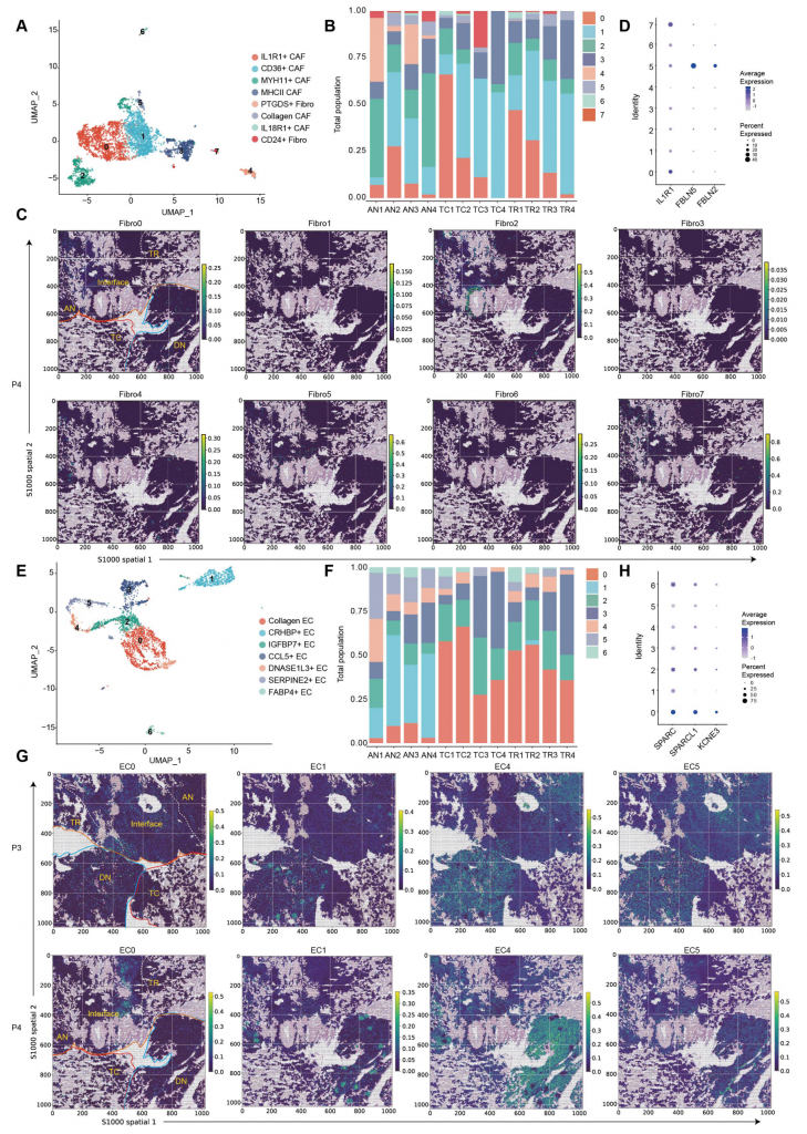 scRNA-seq與空間數據均顯示,ccRCC存在8種激活的成纖維細胞簇,腫瘤區域成纖維細胞數量高于健康組織,其中CD24+IL32+成纖維細胞顯著富集在腫瘤區域,PTGDS+成纖維細胞幾乎全分布在AN,高表達ECM(胞外基質)形成和EMT的成纖維細胞簇在IF較為富集,IL1R1+?CAF(腫瘤相關成纖維細胞)表現出腫瘤促進表型;7種EC(內皮細胞)簇中4種(0,2,3和6)主要富集在腫瘤組織,3種(1,4和5)在健康組織富集,膠原蛋白EC(0簇)豐度最高,具有促腫瘤特征。總之,不同的ECM蛋白質產生基質細胞傾向于富集在IF并共定位,可能行駛多種功能,包括細胞-細胞交互和胞外組分重構。