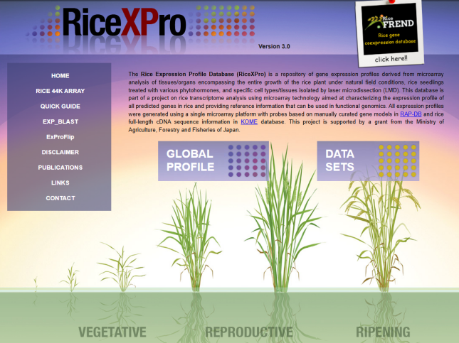 ☆?水稻表達譜數據庫RiceXPro:針對水稻植物在自然田間條件下的整個生長過程、用各種植物激素處理的水稻幼苗以及通過激光顯微切割(LMD) 分離的特定細胞類型/組織,使用微陣列技術進行水稻轉錄組分析,旨在表征水稻中所有預測基因的表達譜。