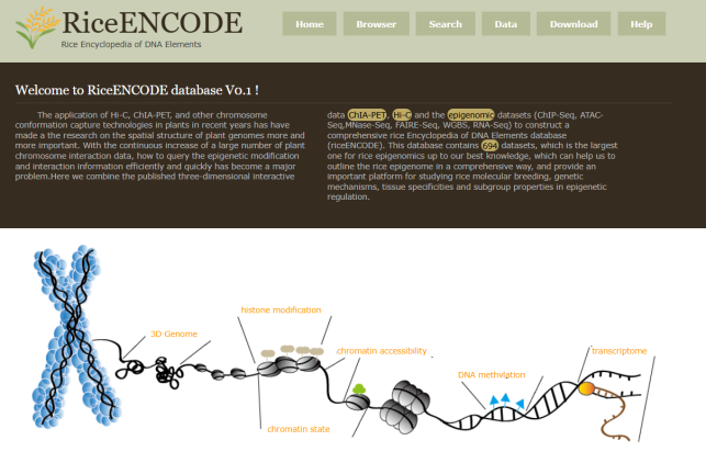 ☆?水稻多元表觀基因組數據的數據庫RiceENCODE:該數據庫收集了包括ChIP-seq,ATAC-seq, MNase-seq, FAIRE-seq, BS-seq, RNA-seq, ncRNA-seq, Hi-C和ChIA-PET?等水稻高通量數據,可查詢不同品種、不同組織、不同染色體區段交互信息,兩兩基因之間交互網絡等。