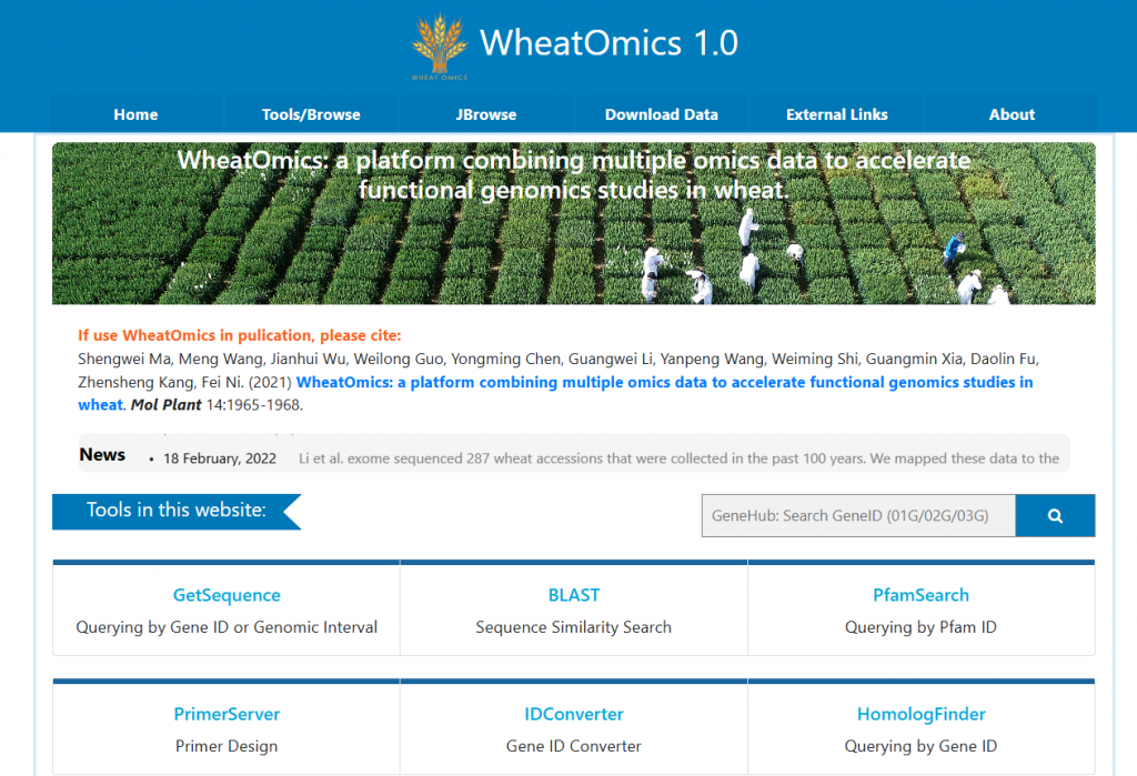 ☆?小麥組學數據在線平臺WheatOmic:實現了對多套麥族物種基因組、轉錄組、變異組、突變體庫外顯子組、表觀修飾組等大數據的可視化,并具有擬南芥/水稻-小麥同源基因鑒定、基因共表達網絡構建、蛋白互作、轉錄因子結合位點分析等多個分析工具。