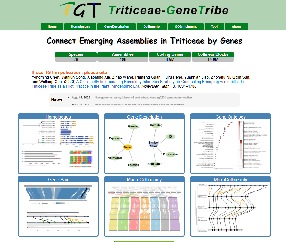 ☆?小麥族同源基因數據庫TriticeaeGeneTribe:利用小麥族物種中已發表的基因組,對不同參考基因組間同源基因鑒定,構建了小麥族同源基因數據庫。同時,數據庫具有基因功能查詢,GO富集分析,同源基因查詢,基因組區間共線性分析等功能。