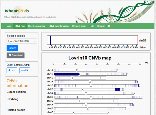 ☆?小麥WheatCNVb數據庫:基于小麥CNVb新型分子標記系統,支持查詢小麥種質資源的CNVb標記,可視化CNVb指紋,并進行基于CNVb指紋的品種比較。