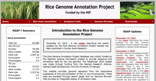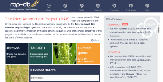 ☆?水稻基因組注釋項目數據庫RGAP與水稻注釋計劃RAP:旨在提供水稻日本晴基因組的序列和注釋數據。該網站提供基因組序列和12條水稻染色體的注釋,基因的分布,或者根據基因名稱查找基因的功能和序列、下載數據或使用blast搜索同源基因。