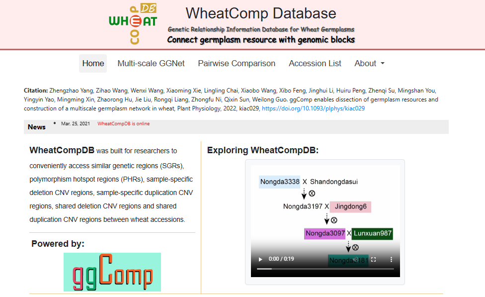 ☆?小麥種質資源血緣區間比較數據庫WheatCompDB:主要針對數據集中任意兩個樣本間的種質資源血緣區間比較分析,支持基因組水平、染色體水平和局部區間水平下種質資源網絡的構建和挖掘。