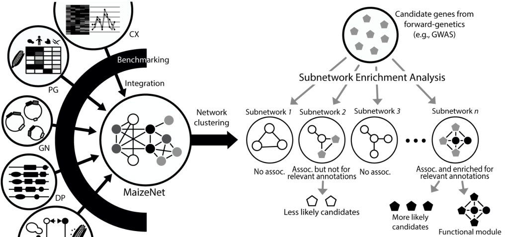 ☆?全基因組范圍的玉米基因輔助功能網絡數據庫MaizeNet:是通過集成?21?個組件網絡構建的,其中每個網絡都是從不同的組學數據中推斷出來的。 通過整合異構數據,MaizeNet?提供了玉米遺傳結構的全面視圖,為特定生物過程確定候選基因的優先級。可以利用?MaizeNet?中實現的優先級服務來生成新的功能假設,縮小候選基因的范圍,并確定該功能的新基因。