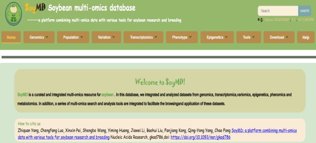 ☆?大豆多組學數據庫SoyOmics:從基因組、變異組、轉錄組、表型組等不同層面整合了大豆相關數據集,實現了不同層次組學數據的交互查詢和聯合比較分析。數據庫目前收錄了多個大豆品系的基因組組裝,注釋數據,以高質量的ZH13作為參考基因組,對2898份材料的全基因組測序數據進行了全基因組序列變異檢測,鑒定到約3800萬條SNP/INDEL變異數據,提供了來自大豆泛基因組分析的約55萬條結構變異數據以及基于結構變異構建的圖泛基因組。收錄了多個品系不同組織時期的表達數據。數據庫針對115個表型多年多點測定的約2.7萬條表型記錄進行了本體注釋和歸類,并將表型數據與變異數據進行關聯。除以上組學數據外,數據庫同時提供了甲基化測序數據,Soy40K大豆芯片數據。