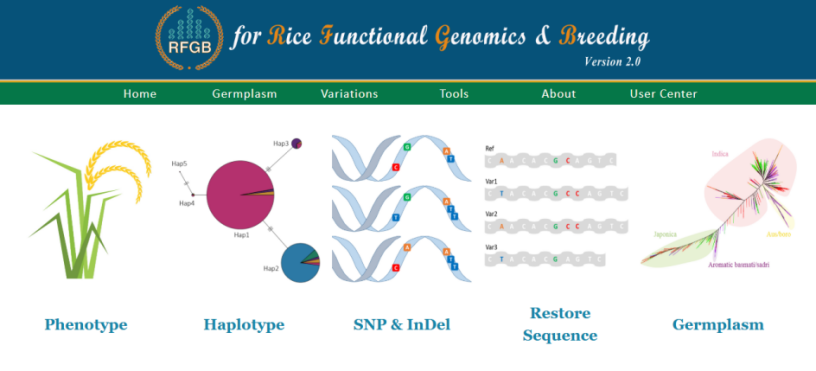 ☆?水稻功能基因組育種數據庫RFGB(v2.0):該數據庫整合了3024份水稻種質資源的18M SNP、2.3M InDel、IRGSP所有基因單倍型和12種表型數據,具有基因檢索、基因組變異可視化瀏覽、BLAST等功能,將表型數據和單倍型數據聯合分析,為挖掘基因有利單倍型提供數據支持。