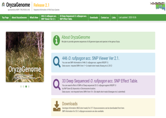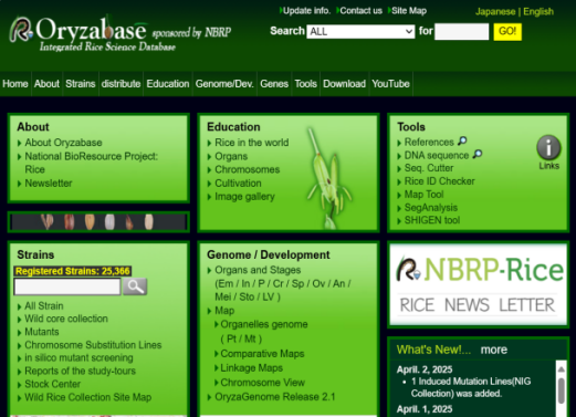 ☆?Oryzabase是一個綜合性水稻科學數據庫,包含大量水稻品系庫存信息,突變體信息,染色體圖譜,基因字典,水稻科學基礎知識。OryzaGenome是野生Oryza物種的基因組數據庫,為水稻研究提供了比較和進化的組學方法。