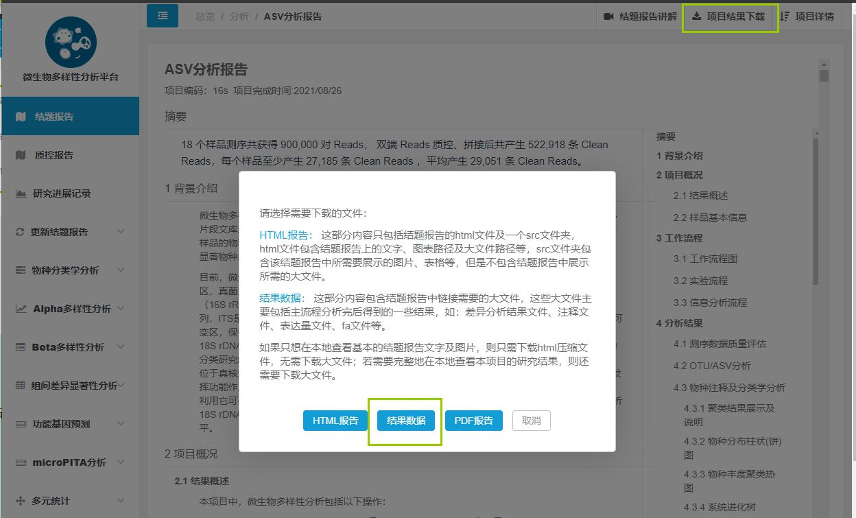 上述報(bào)告查找頁(yè)面 – 打開(kāi)報(bào)告之后 – 點(diǎn)擊報(bào)告右上角 – 項(xiàng)目結(jié)果下載 – 選擇下載結(jié)果數(shù)據(jù)