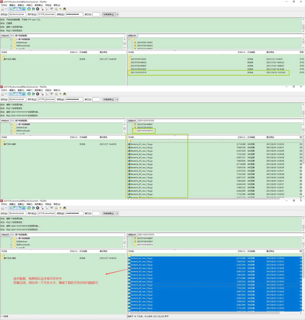 打開(kāi) FTP 客戶端:依次填寫(xiě)好上述主機(jī),用戶名,密碼,端口信息,打開(kāi)之后選擇最新的文件夾,里面就是剛剛選中打包下載的數(shù)據(jù),然后直接選中數(shù)據(jù),拖拽到左邊目標(biāo)文件夾中即可。