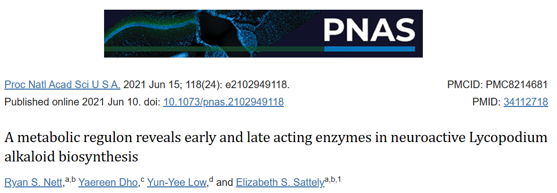 2021年6月,斯坦福大學 Elizabeth S. Sattely 團隊在國際頂尖學術期刊《美國國家科學院院刊》PNAS發表一項重要研究成果,題為:A metabolic regulon reveals early and late acting enzymes in neuroactive Lycopodium alkaloid biosynthesis。研究通過代謝組學和轉錄組學的方法,確定了一組發育受控的生物合成基因,或潛在的調節子,用于調控石松生物堿的生物合成。