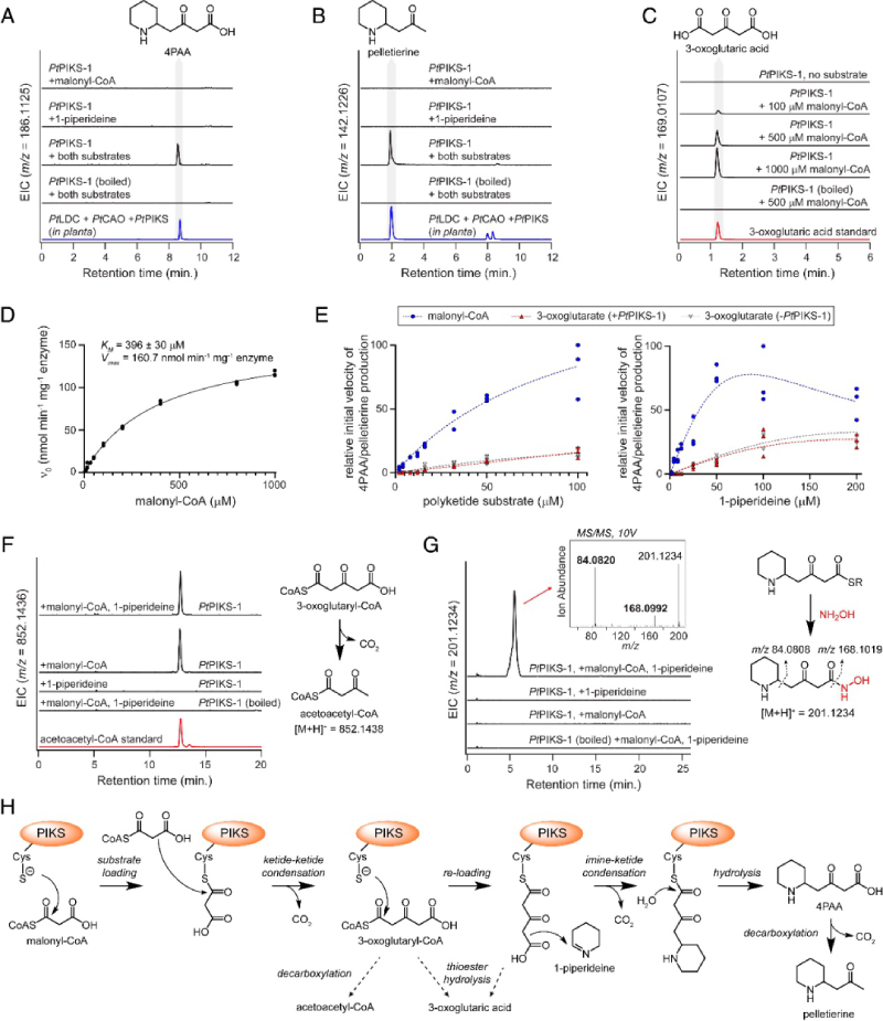 為了更好地了解這種亞胺-酮縮合的機制,獲得了兩種PtPIKS同源基因的純化蛋白用于體外分析。與我們在本式煙草中的結果一致,當添加 1-哌啶和丙二酰輔酶 A 作為底物時,PtPIKS-1和PtPIKS-2在體外測定中都產生了4PAA和pelletierine(圖4 A和B),此外還有其他幾種未知化合物。雖然當單獨孵育 1-哌啶作為底物時沒有觀察到明顯的產物,但僅向PtPIKS-1添加丙二酰輔酶 A 會導致 3-氧代戊二酸的積累(圖 4 C 和 D)。3-氧代戊二酸的積累表明,PIKS能夠催化兩個丙二酰輔酶A單元縮合成硫酯連接的3-氧代谷氨酰基團,并且該聚酮酸從硫酯鍵上酶促或非酶水解。