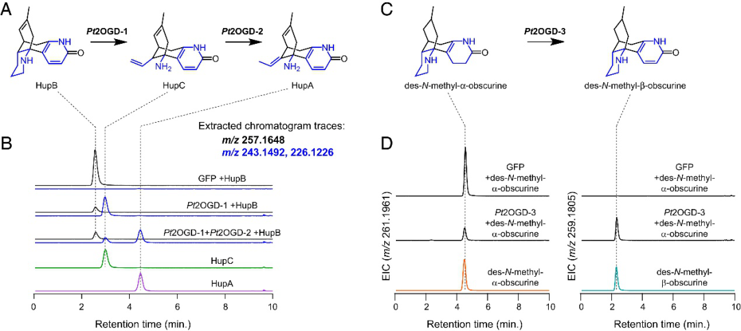 為進一步研究其他下游生物合成途徑。特別是,兩種石松生物堿,des-N-methyl-α-obscurine(DNMAO)和des-N-methyl-β-obscurine(DNMBO),與HupB共享相同的碳骨架,可能是HupB的前體(圖 5)。因此作者通過與上述已知基因的高共表達分析及體外酶活驗證實驗發現另一種獨特的2OGD酶(Pt2OGD-3)能將DNMAO轉化為DNMBO(圖5),從而形成最終在HupA中發現的吡啶酮環。并且發現Pt2OGD-1和Pt2OGD-2可以依次作用于DNMBO,以產生假定的HupC和HupA的8,15-二氫同系物。Pt2OGD-1不作用 DNMAO,表明在DNMBO和HupB中發現的吡啶酮環的存在對Pt2OGD-1底物結合和/或催化活性至關重要,但是參與其中的去飽和酶尚未被發現。