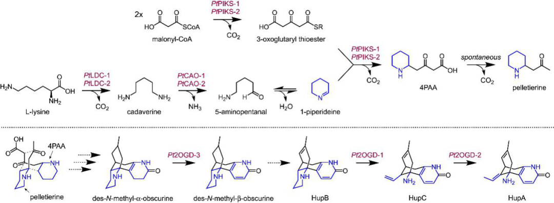 目前研究尚未證實 HupA 生物合成中的任何下游中間體,但從各種苔蘚物種中分離生物堿可能與兩個含8碳哌啶的亞基摻入石松生物堿的生物合成相關(圖 1B)。但是詳細的代謝合成機制還不清楚。作者通過與4PAA/peletierine生物合成的 3 個高度共表達基因分析,作者發現了富集最顯著的一類酶:Fe(II)/2-氧代戊二酸依賴性雙加氧酶(2OGDs)(圖2B,C)。作者將這些高度共表達的2OGD作為下游石松生物堿代謝途徑中的強候選基因。