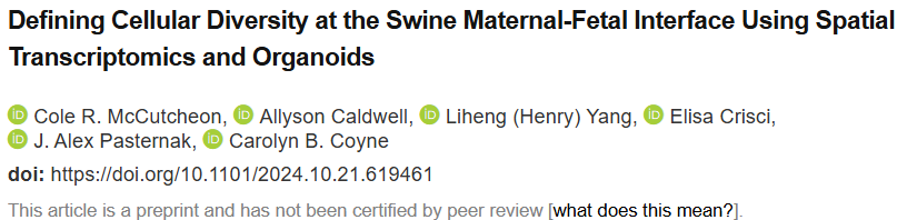 2. Cole R. McCutcheon, et al. Defining Cellular Diversity at the Swine Maternal-Fetal Interface Using Spatial Transcriptomics and Organoids. bioRxiv. 2024.