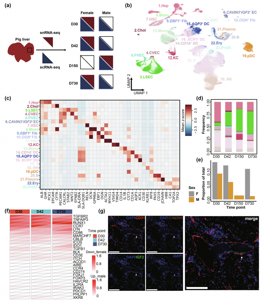 ① 構建迄今最全面的出生后豬肝臟單細胞發育圖譜,涵蓋斷奶前(30天)、斷奶后(42天)、生長高峰(150天)和成年階段(730天)這四個生長發育重要階段,數據涵蓋單細胞轉錄組、單細胞核轉錄組以及單細胞ATAC數據,共鑒定到23種細胞類型,包括肝臟中的三種稀有細胞類型,漿細胞樣樹突狀細胞(pDCs),CAVIN3+IGF2+內皮細胞和EBF1+成纖維細胞。